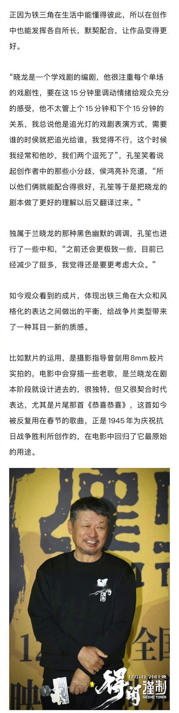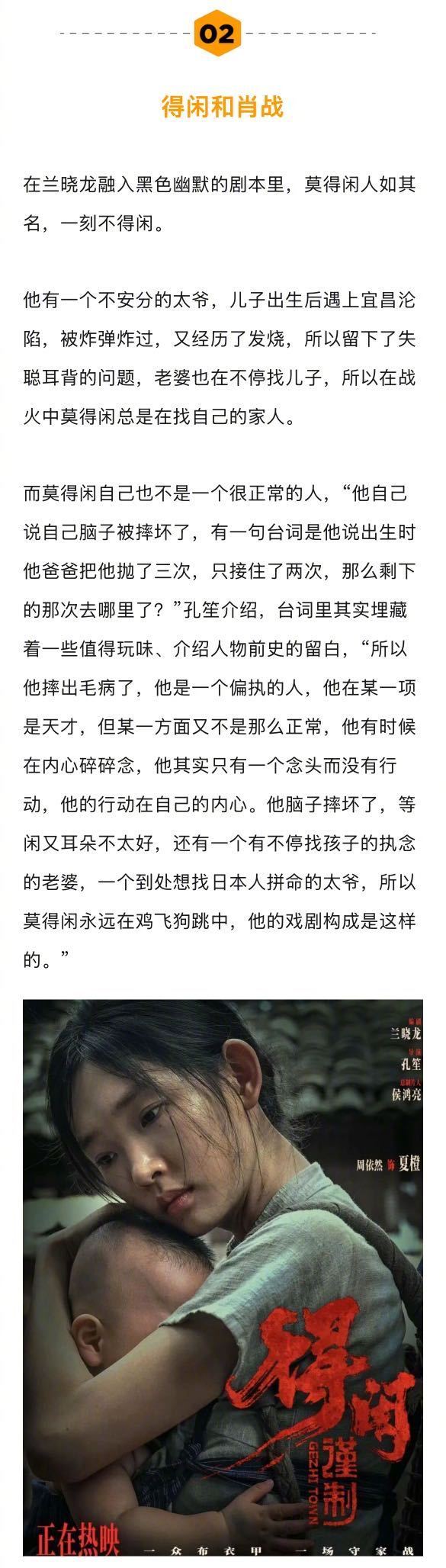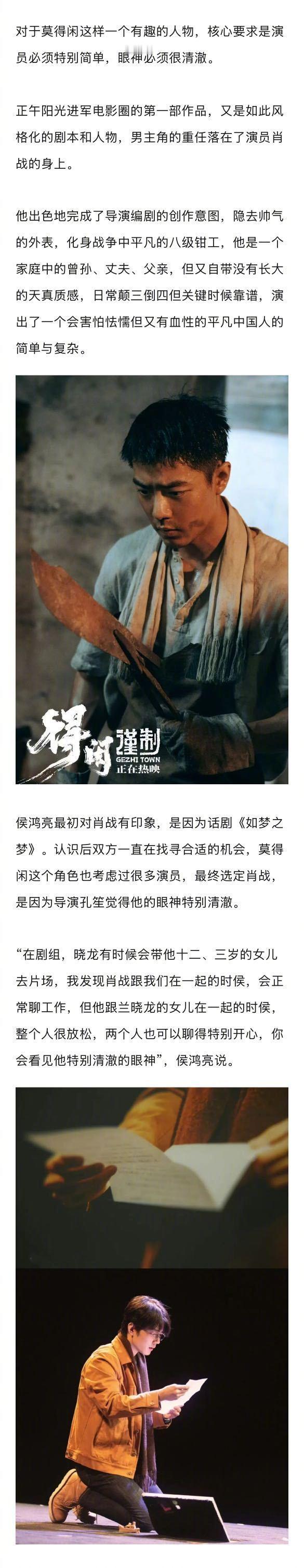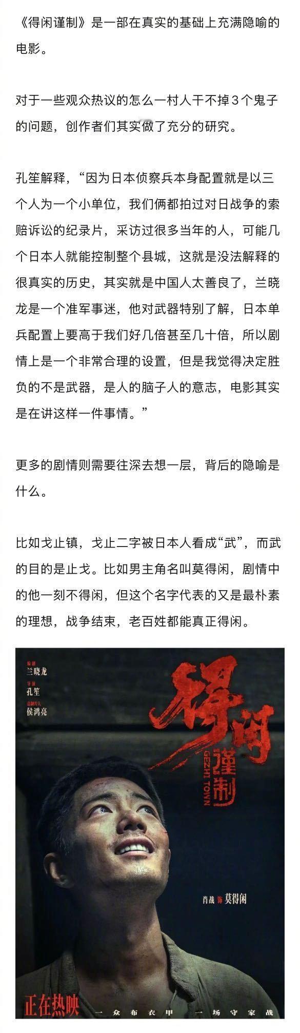 新浪娱乐娱理工作室对话孔笙和侯鸿亮的长文,文中也说《得闲谨制》是一部在真实的基础上充满隐喻的电影。还提到为什么男主角是肖战?“肖战出色完成了导演编剧的创作意图...演出了一个会害怕怯懦但又有血性的平凡中国人的简单与复杂” 侯鸿亮与肖战如梦之梦认识之后一直想要合作。孔笙导演觉得他眼神特别清澈。肖战本人也一直有完全投入的、向上走的态度。电影里也保留了很多南京话的同期声。因为得闲谨制合作的很好,所以有了谍报上不封顶的再次合作。