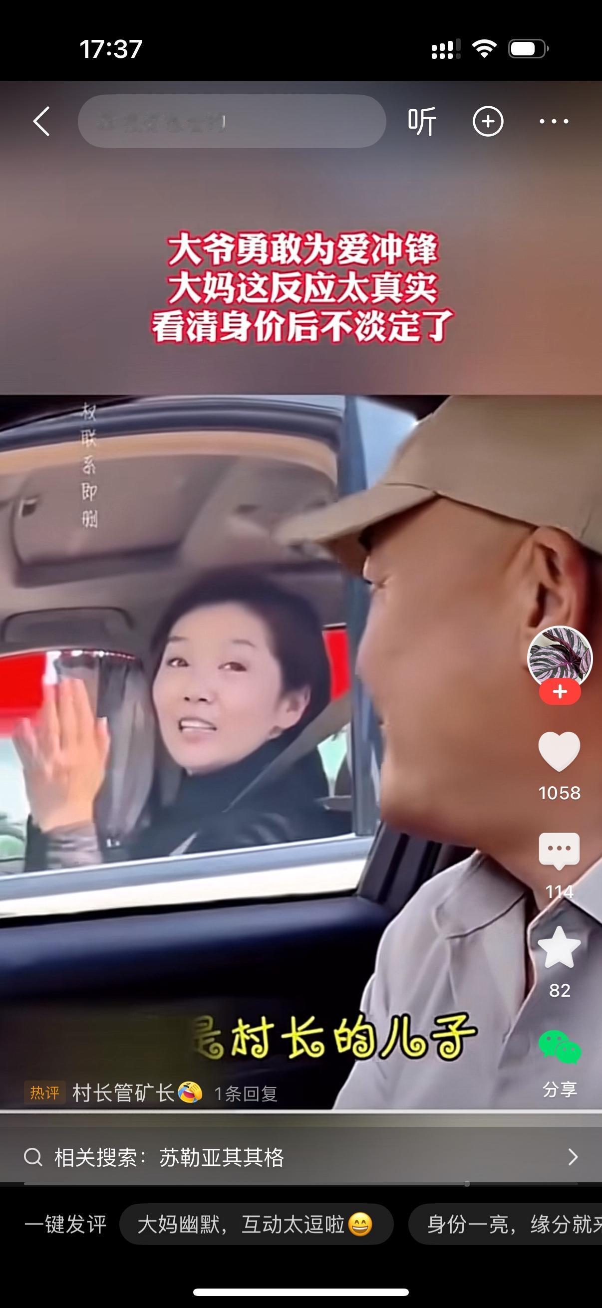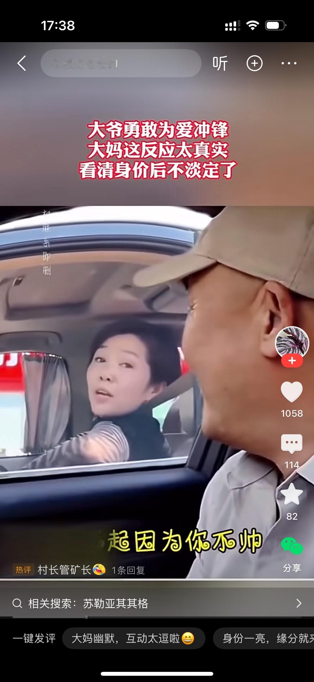 大爷坐在车里对旁边车辆里的大妈说,加个微信可以吗?大妈很直接,不可以,因为你不帅。如果帅的话,可以。大爷说,我家里有矿,我是村长的儿子。大妈笑得花枝招展说,那可以,现在看你也蛮帅的。大爷笑得合不拢嘴。大妈主动把手机递了过来,村长的儿子麻利地加上了她的微信号。