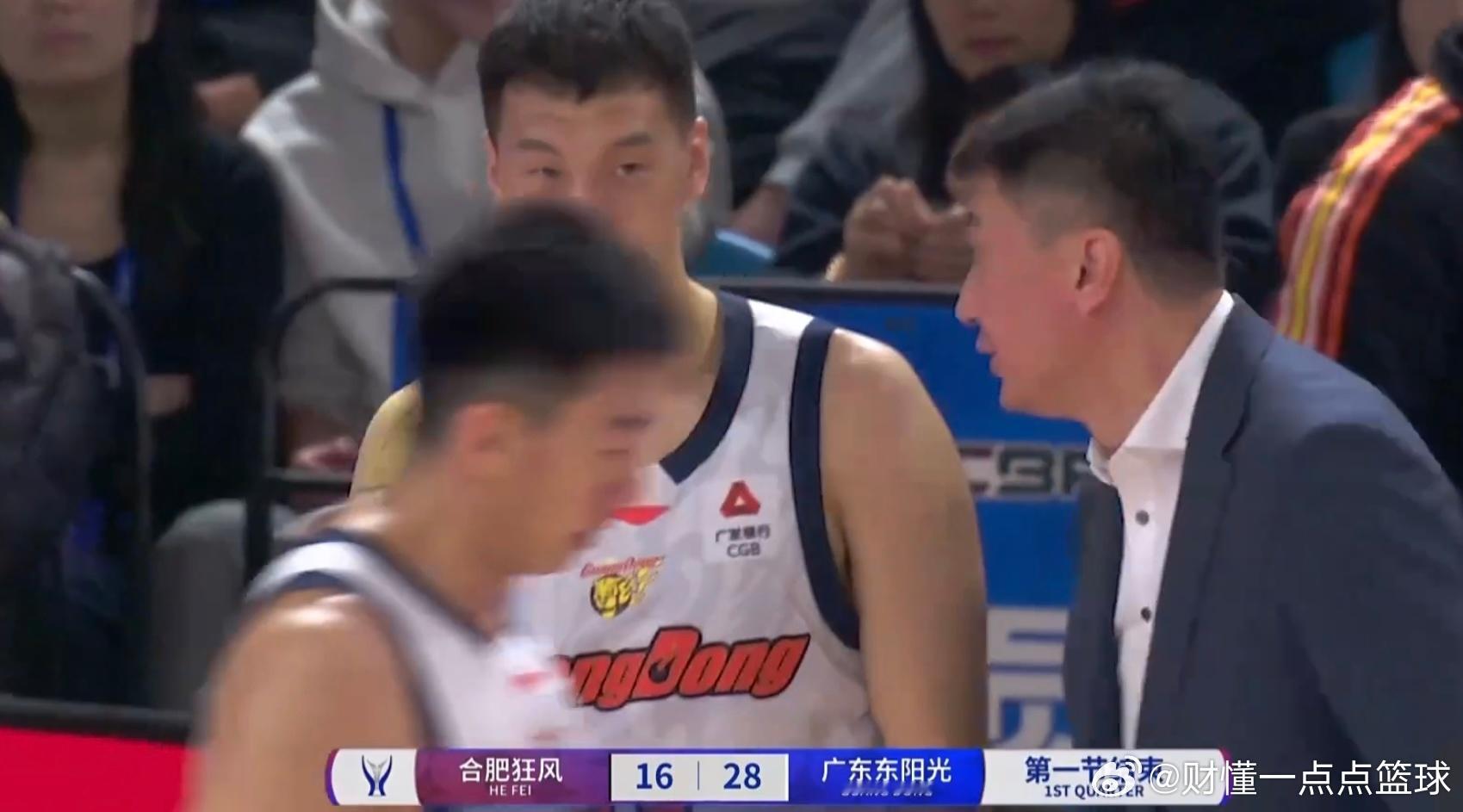 第一节打完,广东宏远男篮28比16暂时领先合肥狂风!胡明轩也上场了,摔了一跤,还