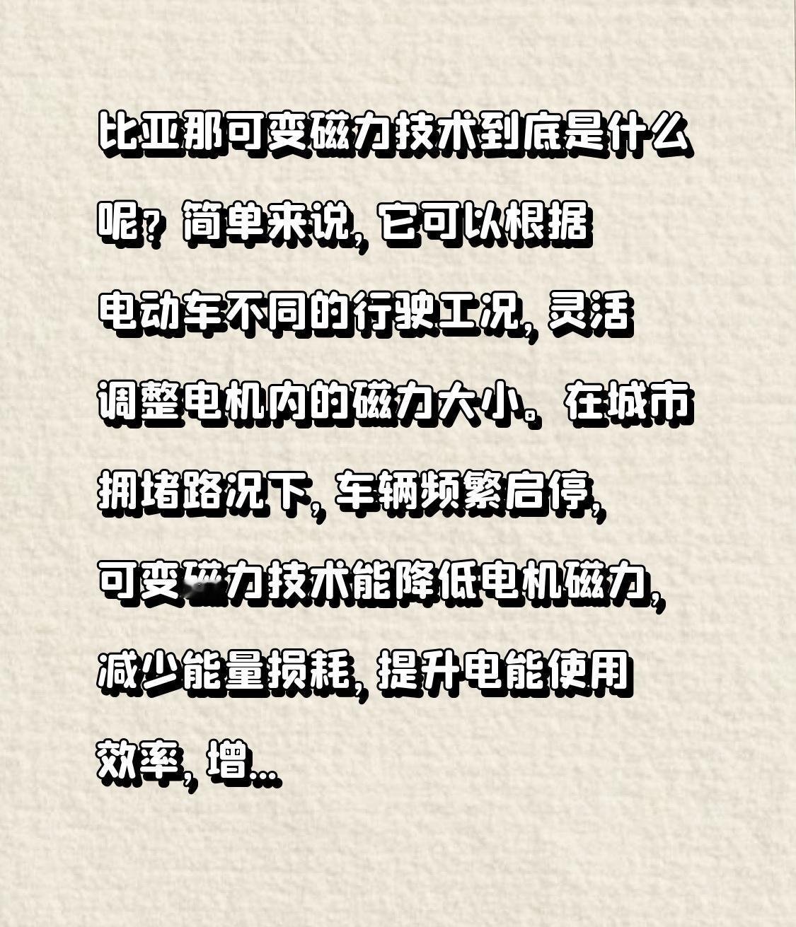 技术狂魔比亚迪又搞大动作了! 这次的可变磁力技术,极可能成为改写电动车格局的关键力量。 比亚迪一直是技术创新的急先锋。从电池领域发家,它不到两年拿下日本三洋在台湾的最大客户,五年成为全球第三大电池供应商,后来又自研锂电池拿下摩托罗拉。在汽车技术研发上同样成果斐然,2011 年就能远程控制车,2012 年搞遥控泊车,2013 年实现对外放电,2020 年推出安全不起火的刀片电池,2021 年 DM - i 超混技术省油又方便。 那可变磁力技术到底是什么呢? 简单来说,它可以根据电动车不同的行驶工况,灵活调整电机内的磁力大小。在城市拥堵路况下,车辆频繁启停,可变磁力技术能降低电机磁力,减少能量损耗,提升电能使用效率,增加续航里程;而在高速行驶需要强大动力时,它又能增大磁力,输出强劲动力。 这项技术对比传统电动车技术优势明显。传统电机的磁力是固定的,无法根据实际情况动态调整,导致在不同行驶场景下,要么动力过剩浪费能源,要么动力不足影响性能。而比亚迪的可变磁力技术完美解决了这一问题。 从行业角度看,一旦可变磁力技术成熟并广泛应用,将让比亚迪在电动车市场的竞争力大幅提升。其他车企如果不能及时跟上,很可能在这场技术竞赛中落后。可以说,比亚迪的可变磁力技术就像一颗投入平静湖面的巨石,必将激起电动车行业的千层浪,重新塑造未来的市场格局。你觉得呢?欢迎大家留言交流,关注我了解更多汽车前沿知识! 比亚迪