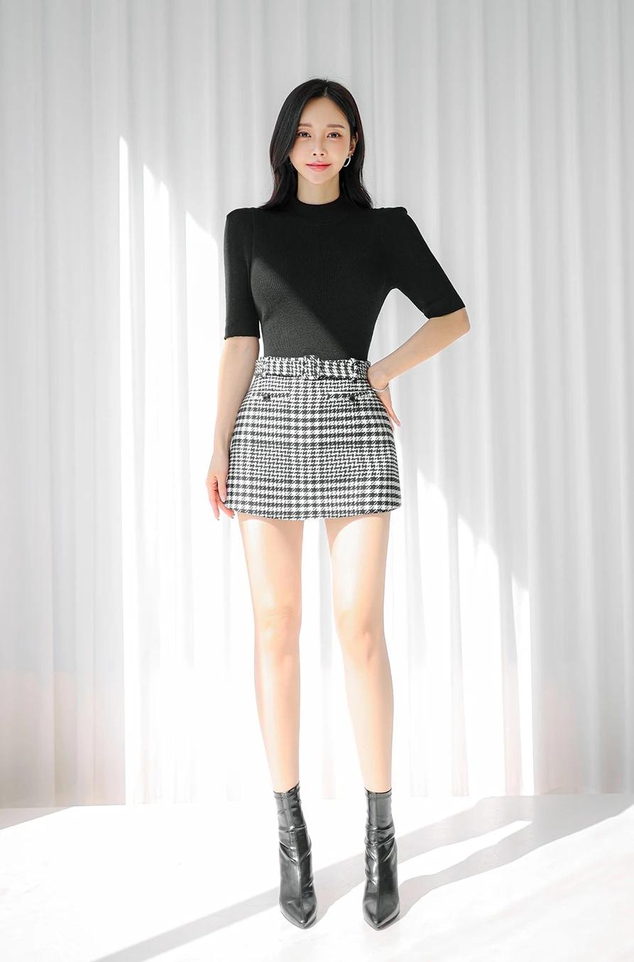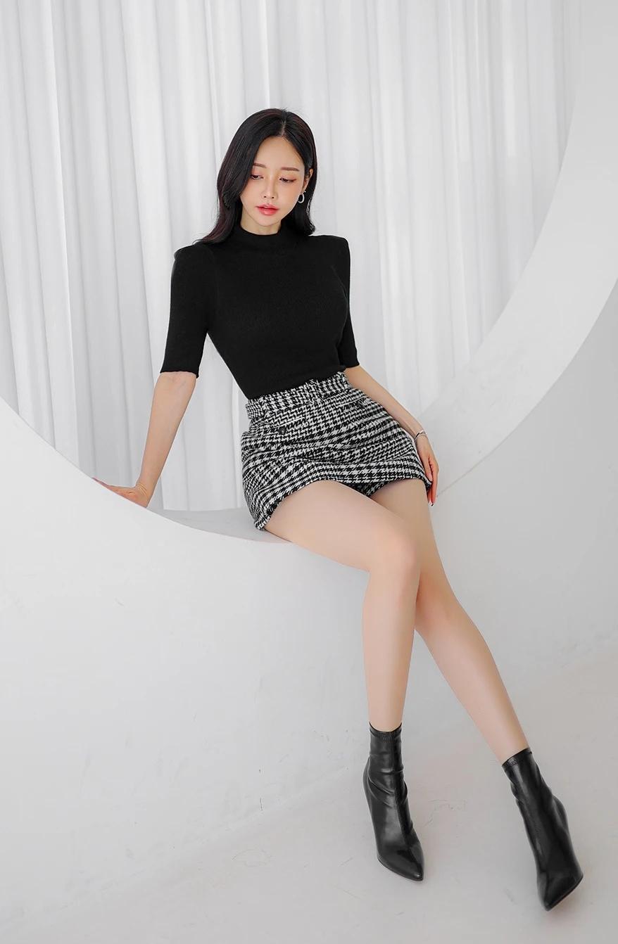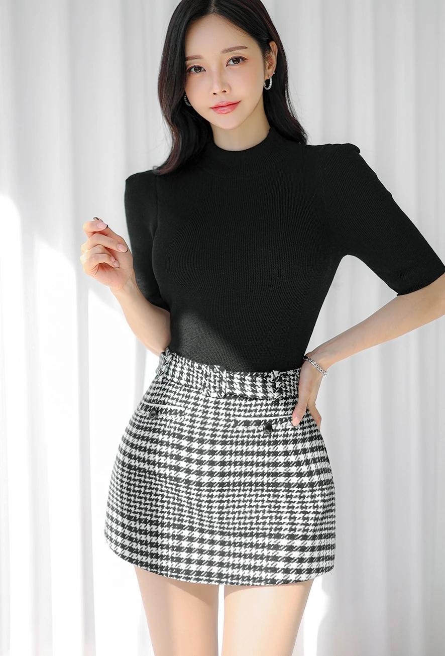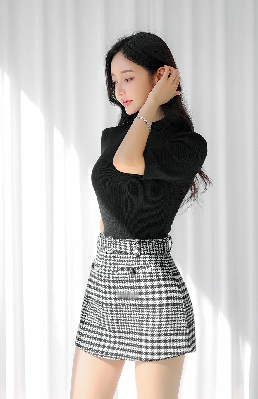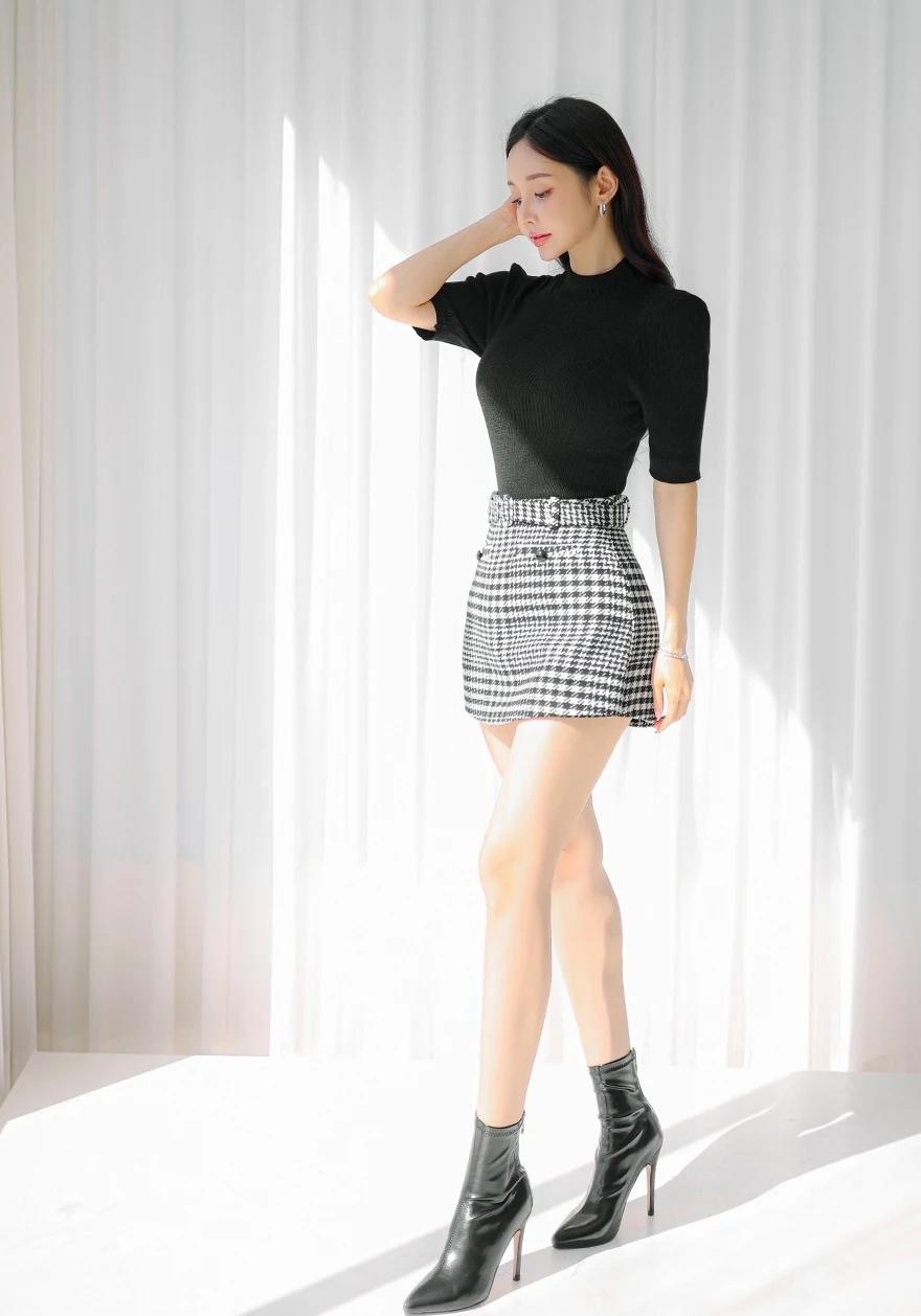 孙允珠-这身搭配好时髦,黑色上衣配格子裙。甜美小仙女的穿搭 ins韩搭日常照