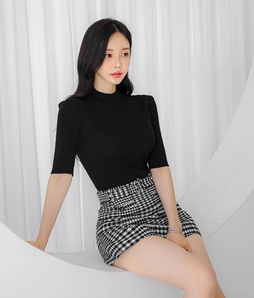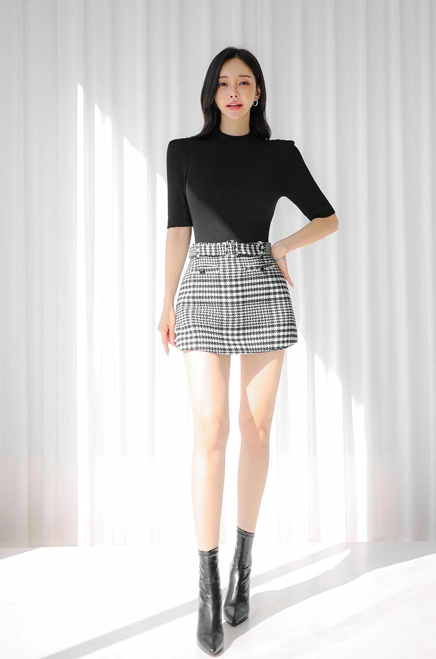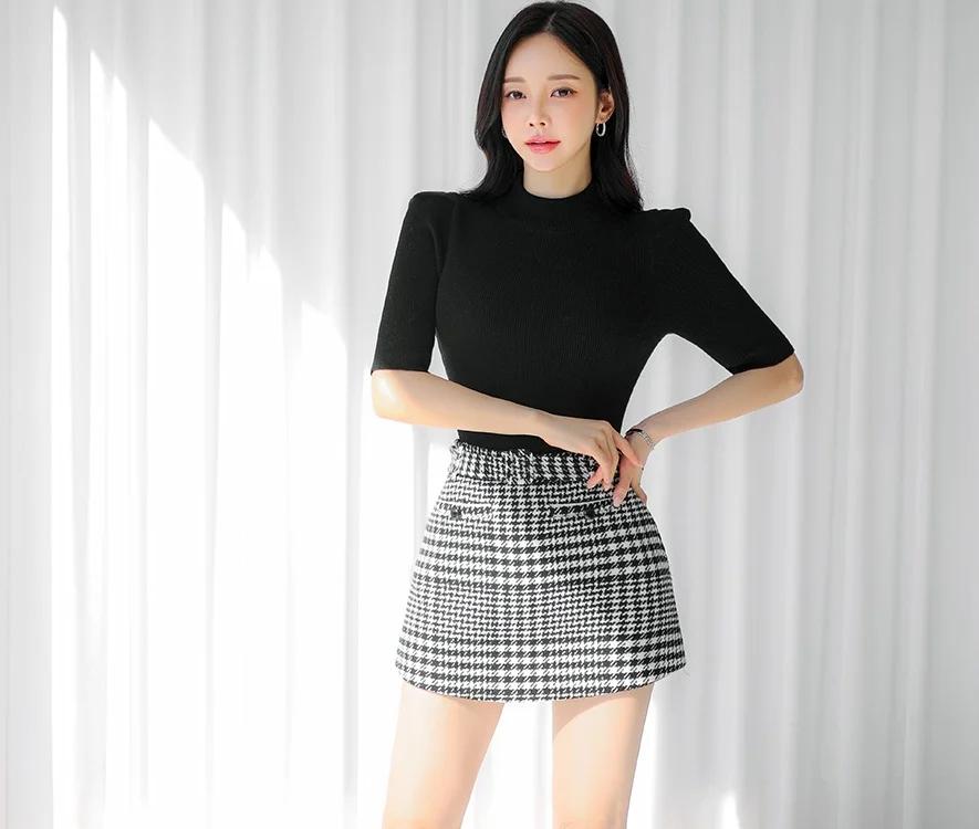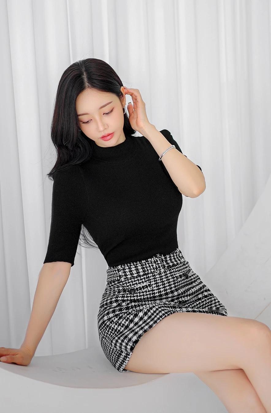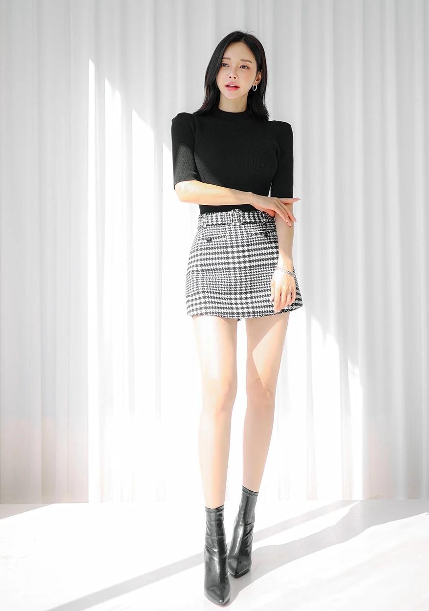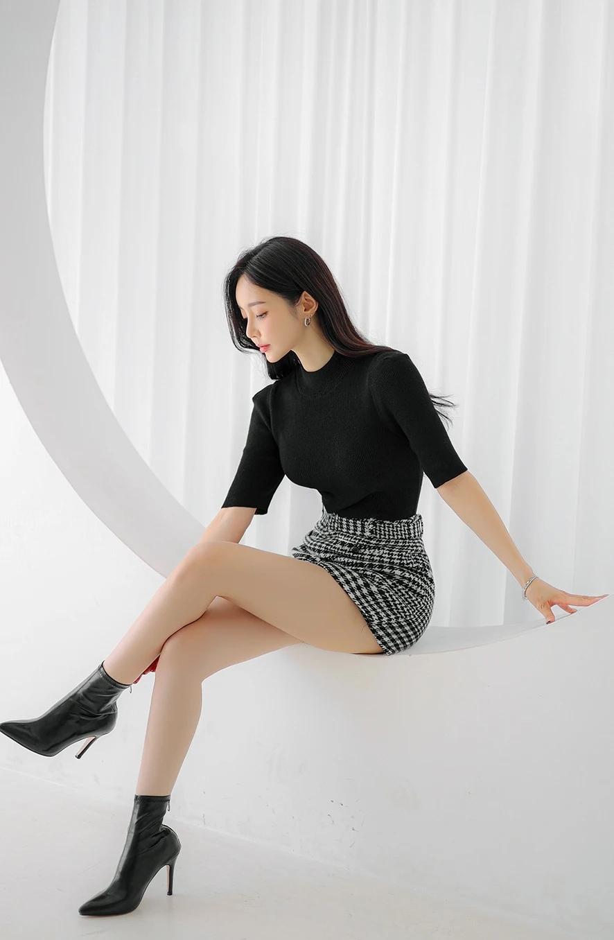 孙允珠-这身搭配好时髦,黑色上衣配格子裙。甜美小仙女的穿搭 ins韩搭日常照