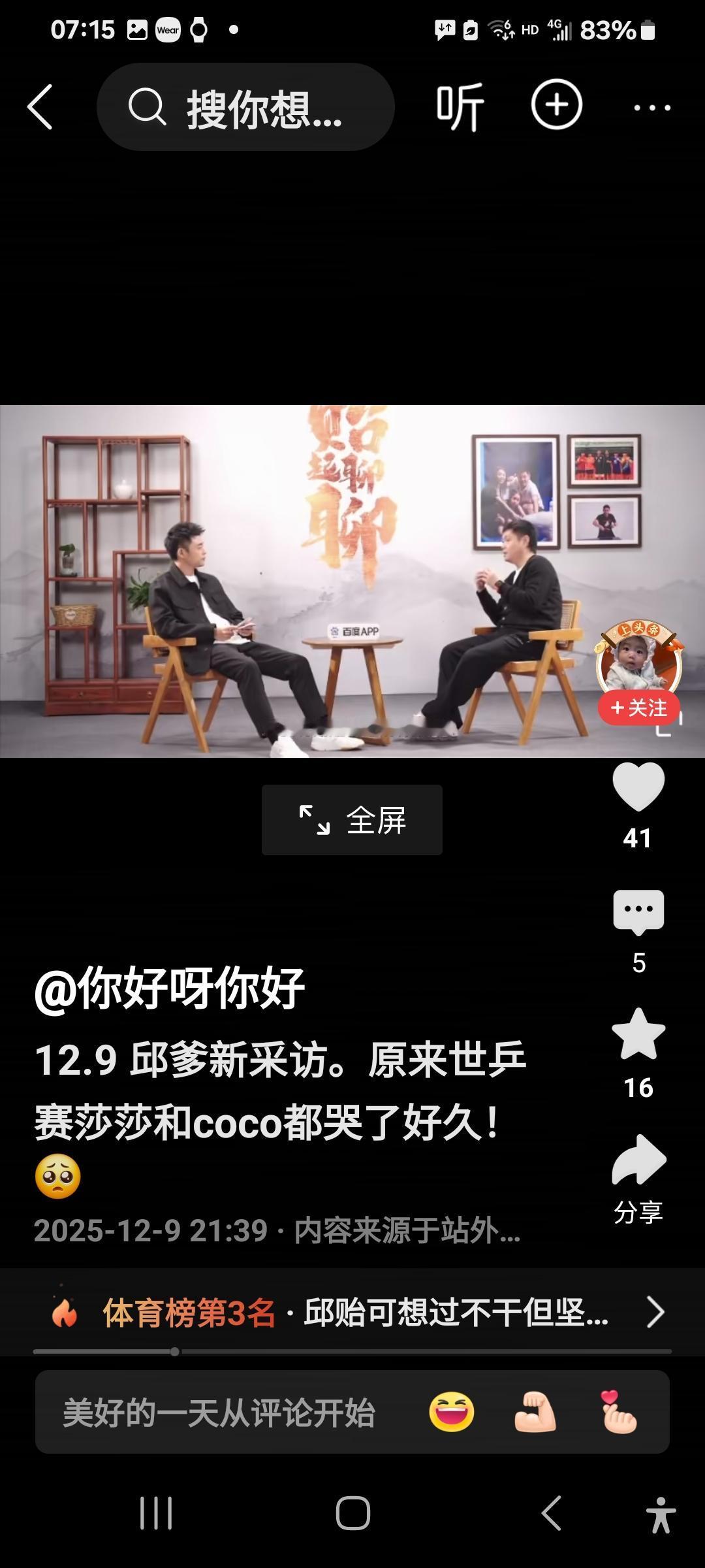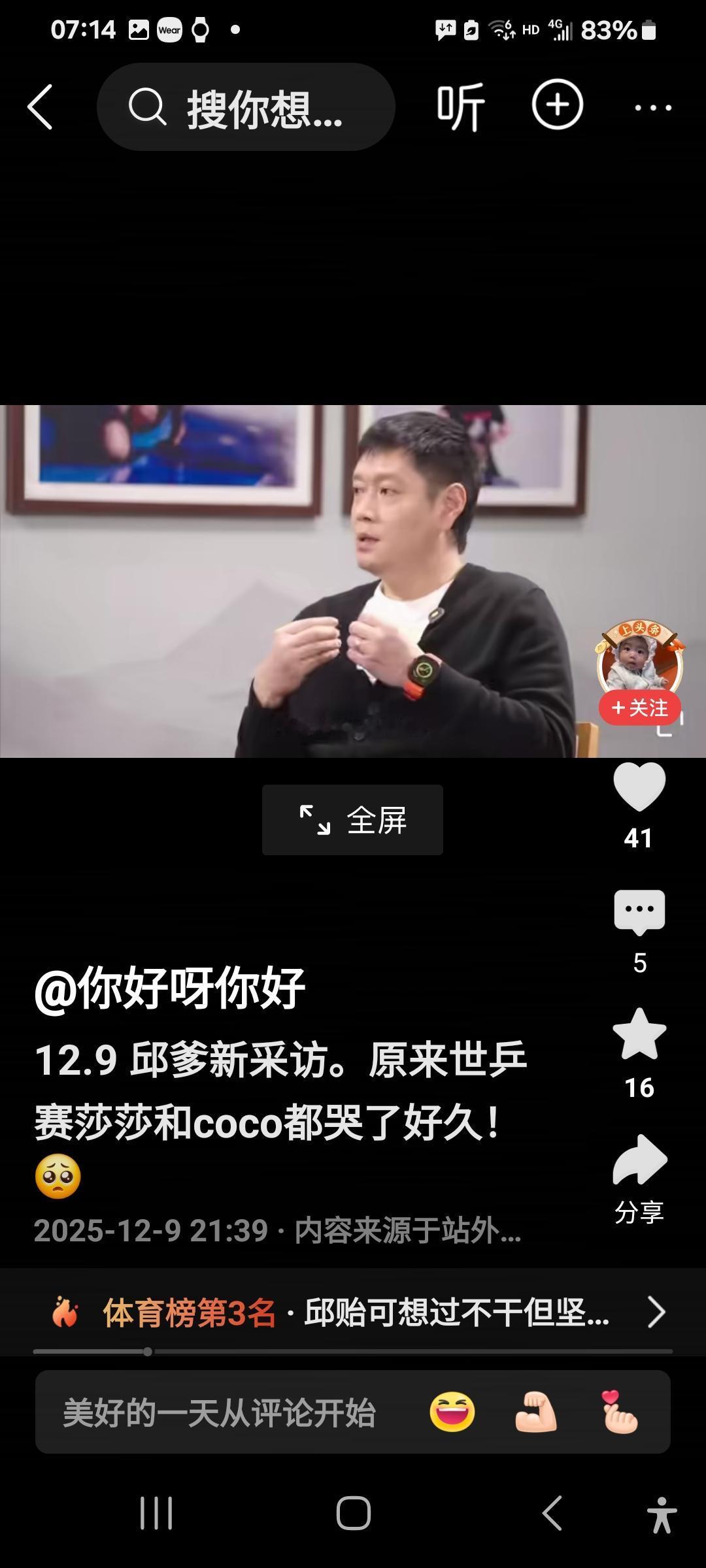 一觉醒来,发现coco对莎莎的最新评价! coco又痛苦地回忆了莎莎全运会从7:1到8:2的领先,然后再到9:11的落败。 coco坦陈莎莎的波动就是问题,有了问题说明还有上升空间。 coco还说每输一场球,就会遭到网暴,这个滋味不好受,很多次想过不想干了,但想到还有重要任务没完成,才坚持了下来。 我们觉得,比赛密集,得不到休息调整,特别是包括粉丝和媒体等方方面面对莎莎的无限和迫切期待,以及莎莎充满了对奥运会和全运会胜利的渴望,使自己压力太过巨大,因而在决赛的时候,想赢怕输的思想一旦闪现,脑子就会出现空白,就会输掉比赛,非常可惜。 因此,针对这种情况,莎莎需要进行专项的心理技术训练。