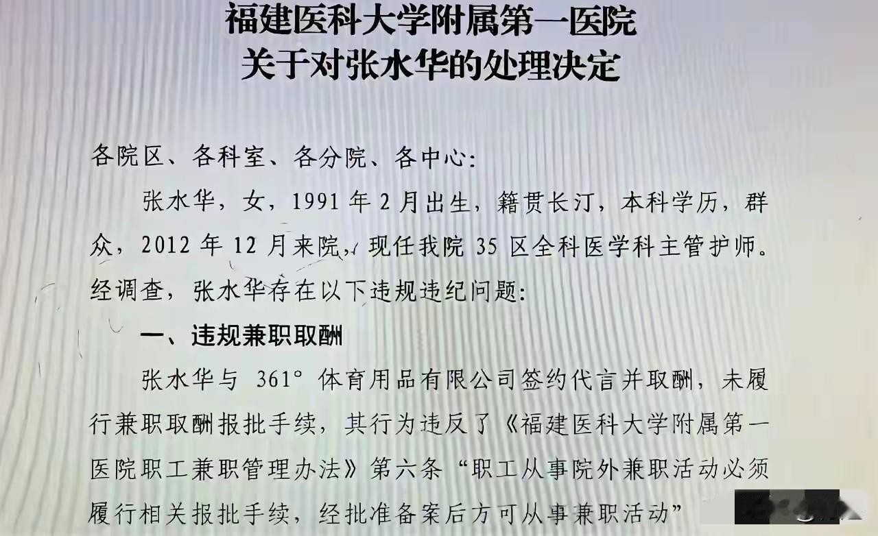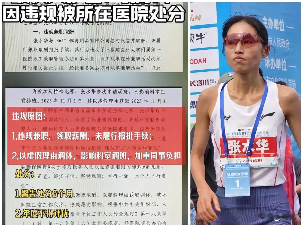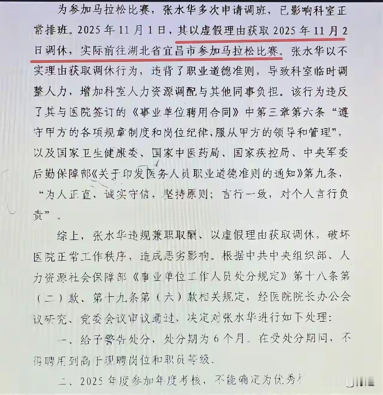 最快女护士张水华被医院处分, 说到底,就是得罪人了, 而且是谁举报的也很好猜! 这个处分截图一看就是电脑截图的,才会有显示器那个模糊的印记; 处分里面有一条称张水华调休理由是造假的,能知道她调休的,无非就是同科室里人。 从这个处分来看,医院已经很好了。 医院并不是不允许你兼职,而是你兼职取酬劳没有报批;不是不允许你调休,而是你为了跑马拉松欺骗调休。 还有最重要的一点,你既要又要,多次调休,已经影响了科室排班,同科室的人应该深受其害,忍无可忍了。