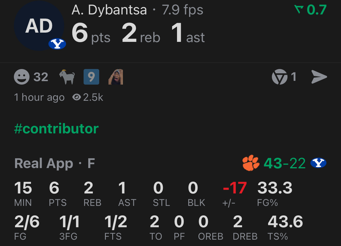 杰明今天在麦迪逊广场花园观战母校杨百翰对阵克莱门森,结果半场结束前杨百翰直接被轰了一波21比0,迪班萨半场6分2板1助攻。NCAA