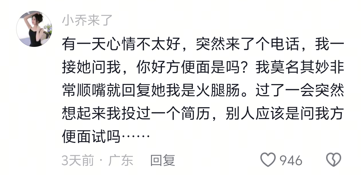 突然来了个电话,我一接她问我,你好方便面是吗? 我非常顺嘴就回复她我是火腿肠