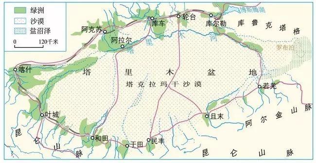 塔里木盆地拥有我国最大,世界第二的流动性沙漠-塔克拉玛干沙漠。 塔里木盆地位于中国新疆南部,是中国面积最大的内陆盆地。地处于天山和昆仑山、阿尔金山之间,东西长1500千米,南北宽约600千米,面积达53万平方千米。盆地地势西高东低,中部是著名的塔克拉玛干沙漠,东部有亚洲“干极”罗布泊,盆地边缘为山麓、戈壁和绿洲(冲积平原)。塔里木盆地是大型封闭性山间盆地,地质构造上是周围被许多深大断裂所限制的稳定地块,盆地地势西高东低,微向北倾,旧罗布泊湖面高程780米,是盆地最低点。塔里木河位置偏于盆地北缘,水向东流。盆地地貌呈环状分布,边缘是与山地连接的砾石戈壁,中心是辽阔沙漠,边缘和沙漠间是冲积扇和冲积平原,并有绿洲分布。塔里木河以南是塔克拉玛干沙漠,是中国最大沙漠,为居世界第2位的流动沙漠。盆地水分主要来自西风气流,盆地降水稀少,盆地本身无法形成径流,较大河流有南部的叶尔羌、克孜勒、盖孜、和田、克里雅等河,北部的阿克苏、台兰、渭干、库车及开都(下游称孔雀)等河。盆地地下水的补给主要来自河床、渠道及田间渗漏,地下水动储量为110~148亿立方米。 塔里木盆地 塔克拉玛干 胡杨林 塔里木盆地水系