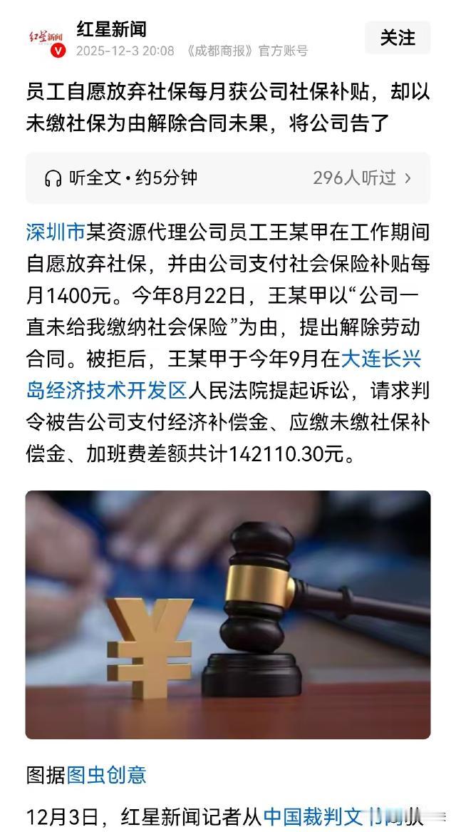 深圳,男子入职某公司时自愿放弃社保,改为每个月领1400元社保补贴。两年后男子以