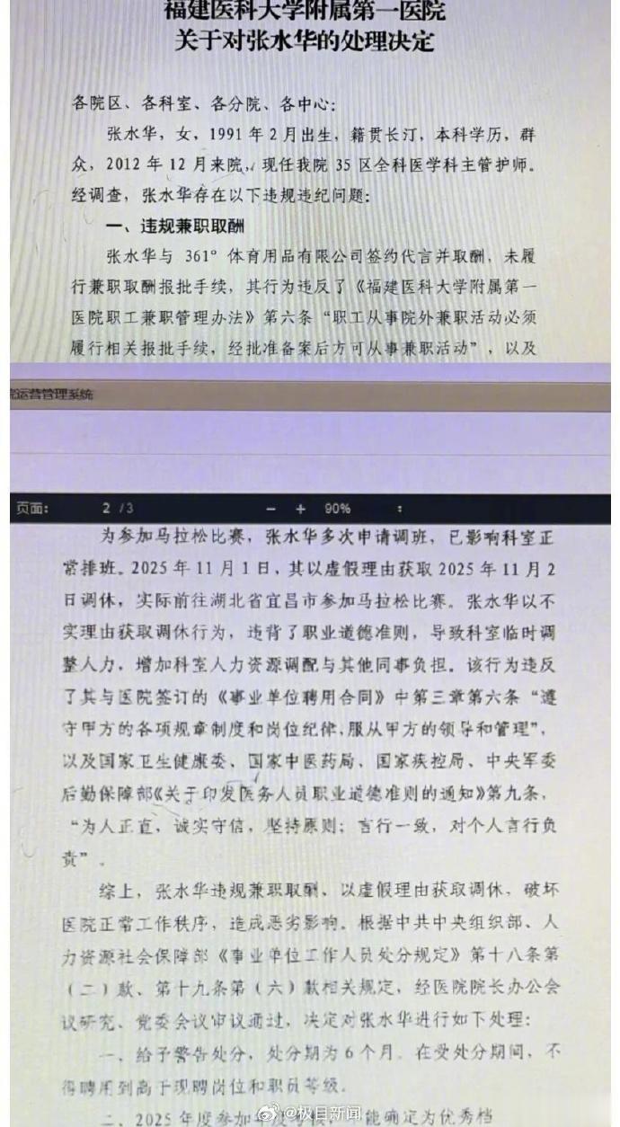 12月9日晚,网络流传一份福建医科大学附属第一医院的处理决定截图显示,“最快女护士”张水华存在违纪问题。包括与361°体育用品有限公司签约代言并取酬,未履行兼职取酬报批手续。还包括,2025年11月1日,张水华以虚假理由获取2025年11月2日调休,实际前往湖北省宜昌市参加马拉松比赛,张水华以不实理由获取调休行为违背了职业道德准则,导致科室临时调整人力,增加科室人力资源调配与其他同事负担。张水华被医院警告处分6个月,并不能参与2025年评优。