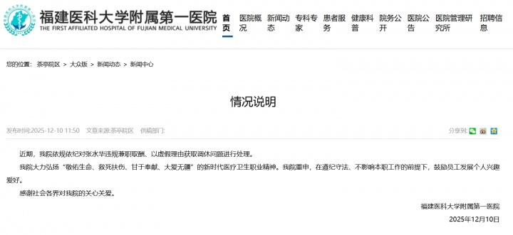 直播吧12月10日讯12月10日,福建医科大学附属第一医院官网发布情况通报:近期,我院依规依纪对张水华违规兼职取酬、以虚假理由获取调休问题进行处理。