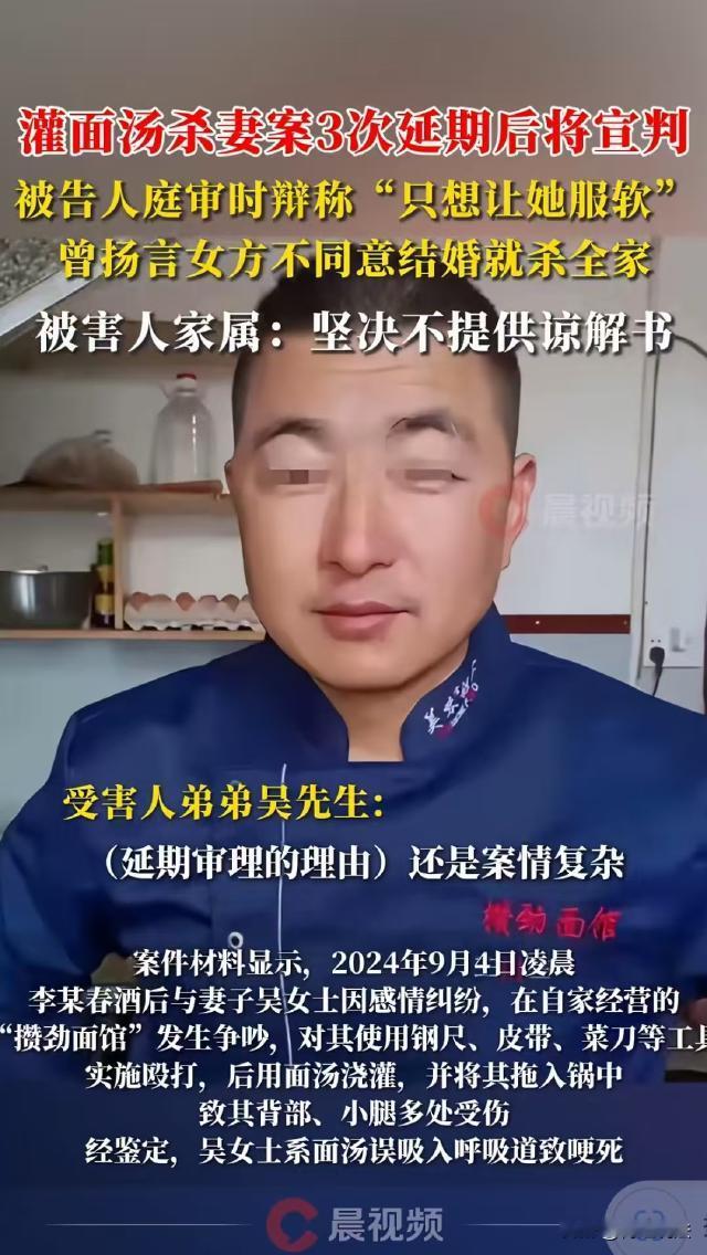 陕西渭南,男子和妻子发生争执,凌晨时分男子用皮带、钢尺、菜刀等殴打妻子,还将她按进六七十度的煮面锅里致死。案发后男子狡辩称,他没有家暴,只是喝多断片了想让妻子服个软。可据检测,男子血液酒精含量仅为37mg/100ml。 据潇湘晨报.晨视频报道,本月12号,本案即将迎来宣判。 据被害人吴女士的家属称,吴女士2岁时丧父,后来随母亲改嫁。 从小到大,吴女士一直因为没有亲生父亲被人嘲笑歧视,童年的经历,养成了她胆小怯弱的性格。 和被告李某认识后,吴女士的父母觉得李某不像善茬,不同意他们结婚,可吴女士执意和李某在一起。 后来,家属才知道,李某曾威胁吴女士,如果吴女士不嫁给他,他就杀了吴女士全家。吴女士害怕之下,不敢不答应。 婚后,李某经常对吴女士大打出手,附近邻居和食客多次目睹或听到李某殴打吴女士,但因为是别人的家事,他们并不好插手。 与此同时,吴女士从来没有对家人说过自己的困境,和家里一直都是报喜不报忧,家人一直认为她过的不错。 2024年8月底,吴女士曾和李某闹过离婚,可是因为家属一直劝和,最后婚没离成,李某带吴女士去旅游了两天,两人又和好了。 可没过几天,9月4日凌晨,李某和吴女士又因为感情问题吵了起来,李某一怒之下用菜刀、皮带、钢尺等对吴女士进行了殴打。 打完后李某觉得不解气,又将吴女士拖到外面半人高的煮面条大锅旁边,将吴女士提起来按到了面条汤里。 当时天气还比较热,面馆虽然已经打烊有一阵了,但锅里的面条汤温度还有最少六七十度。 吴女士被按进锅里后吸入了不少面条汤,连连咳嗽,不多久,就因为面汤误吸入呼吸道导致梗死。 据吴女士的母亲称,案发当天凌晨,3点多钟她接到了李某的电话,称他和吴女士吵架了,5点多,李某再次打电话来,称她女儿已经不行了。 案发后,李某辩解他当时喝醉断片了,但经酒精检测,李某的血液酒精含量仅为37mg/100ml。 李某称,他没想要吴女士的命,只是吓唬吓唬她,让她对自己服个软。 不久,李某因涉嫌故意杀人罪被提起公诉。 庭审时,李某否认自己家暴,还自称一直对吴女士非常好,和她感情很好。 李某不承认自己有杀害妻子吴女士的故意,为什么仍被控故意杀人罪? 故意杀人罪要求行为人主观上具有非法剥夺他人生命的故意,主观故意又包括直接故意和间接故意。 直接故意是指行为人明知自己的行为必然或者可能发生危害社会的结果,并且希望这种结果的发生。 虽然李某辩称只是想让吴女士服软,并非要其性命,但从他的行为细节来看,存在直接故意的可能性。 李某使用皮带、钢尺、菜刀等工具对吴女士进行殴打,这些工具具有较强的伤害性。菜刀作为一种锋利的刀具,在一般认知中,如果使用不当很容易对他人身体造成严重甚至致命的伤害。 李某选择使用这些工具实施暴力,说明他对可能造成吴女士身体严重损伤的结果是有认知的。 并且,李某在殴打过程中,持续使用多种工具,显示出其行为的主动性和攻击性,这种积极的暴力行为有可能反映出他内心希望通过这种激烈的方式来达到控制甚至伤害吴女士的目的,存在追求危害结果发生的直接故意心理。 间接故意是指行为人明知自己的行为可能发生危害社会的结果,并且放任这种结果的发生。 李某将吴女士按进六七十度的煮面锅里这一行为,更符合间接故意的特征。 李某作为一个具有正常认知能力的人,应当清楚六七十度的高温液体对人体的伤害性,尤其是将人按进这样的液体中,极有可能导致严重的烫伤甚至危及生命。 李某在实施将吴女士按进锅里的行为时,虽然可能没有明确追求吴女士死亡的结果,但他对这种可能导致死亡的结果采取了放任的态度。 他不顾吴女士的安危,依然实施该行为,表明他对吴女士生命安全的漠视,在主观上已经对可能出现的死亡结果持一种听之任之的态度。 根据《刑法》第十四条规定:明知自己的行为会发生危害社会的结果,并且希望或者放任这种结果发生,因而构成犯罪的,是故意犯罪。 李某的行为无论是从直接故意的可能性,还是间接故意的明显特征来看,都符合故意犯罪的构成要件。 根据《刑法》第二百三十二条规定:故意杀人的,处死刑、无期徒刑或者十年以上有期徒刑;情节较轻的,处三年以上十年以下有期徒刑。 李某的行为完全符合故意杀人罪的构成要件,并最终导致吴女士因面汤误吸入呼吸道梗死死亡的结果,他被控故意杀人罪是有充分的法律依据的。 李某所谓的喝多断片、只是吓唬吴女士等辩解,在其行为所反映出的主观故意面前,难以成立。