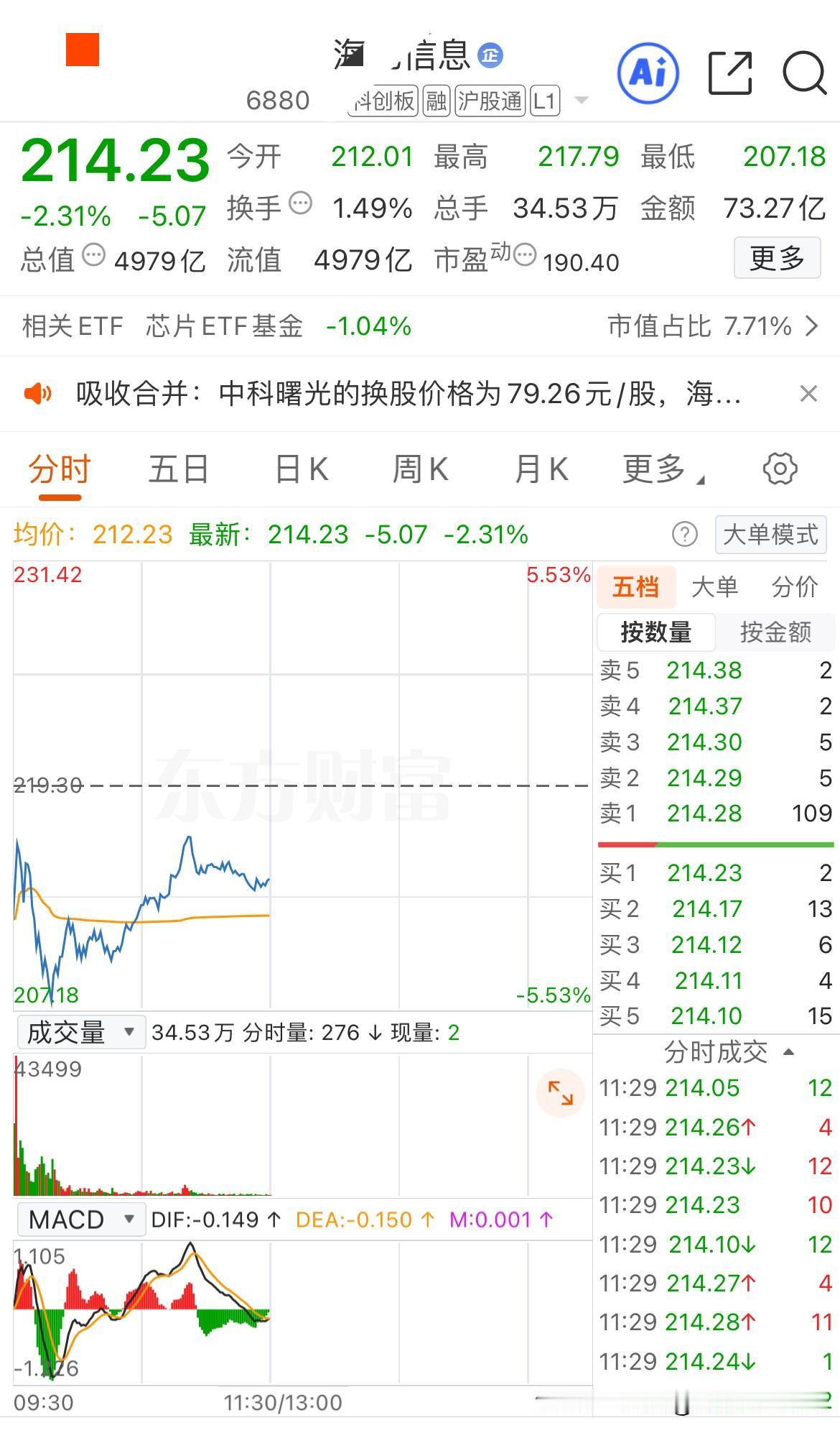 中科曙光闪崩跌停,海光信息也一度跌超5%,200多亿市值蒸发,全是昨晚的一纸公告惹的祸! 今年5月26日,海光信息与中科曙光同时发布公告称海光信息拟换股吸收合并中科曙光!当时很多人都认为这将是国产芯片巨头与国产服务器巨头的强强联合,而此后两家公司也一直在有条不紊的推进重组工作! 但没想到半年后的昨晚,海光信息与中科曙光却突然发布公告称重大资产重组终止,双方给出的失败原因则是交易规模大、涉及相关方多以及市场变化导致重组条件不成熟。 但是本质上应该还是各个利益方没有谈拢,最终在半年后还是谈崩了,干脆就终止了重组! 两家公司重组就这么终止了,可是两家公司的股民可惨了,海光信息低开3.3%,开盘后虽然向上拉了一下但很快就掉头向下,最低的时候一度跌超5%! 而原本要被收购的中科曙光可就更惨了,直接跌停开盘,开盘后拉升了一下后就再次跌停,截至午间收盘仍有28万手封单,不出意外的话今天跌停板是开不了了!