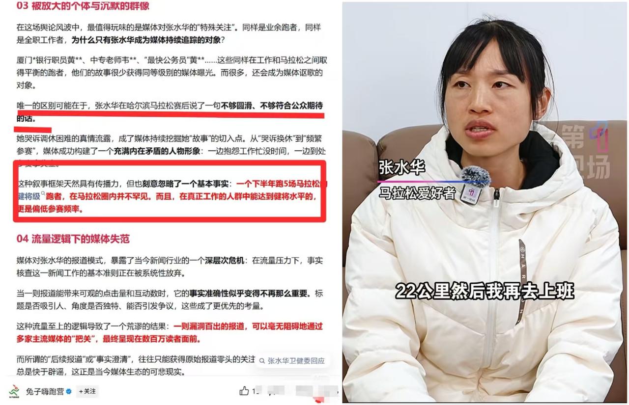 张水华所属医院正式发布情况通报, 医院用了“依法依纪”这四个字。 不过我们注意到,MCN机构还在替张水华“叫屈”:在赛后说了一句不够圆滑、不够符合公众期待的话。 机构还强调,大众都忽略了一个基本事实:一个下半年跑5场马拉松的健将级跑者,在马拉松圈并不罕见。 对于机构的这个说法,大众明显不买账。 医院处罚张水华是因为她违规兼职取酬,以及调休理由造假,跟你会不会说话,跑马拉松有多厉害没有关系。 完全不顾科室同事和领导曾经给予她的便利和帮助,想让媒体隐形施压医院,背刺了他们,这才是大众反感的关键吧!