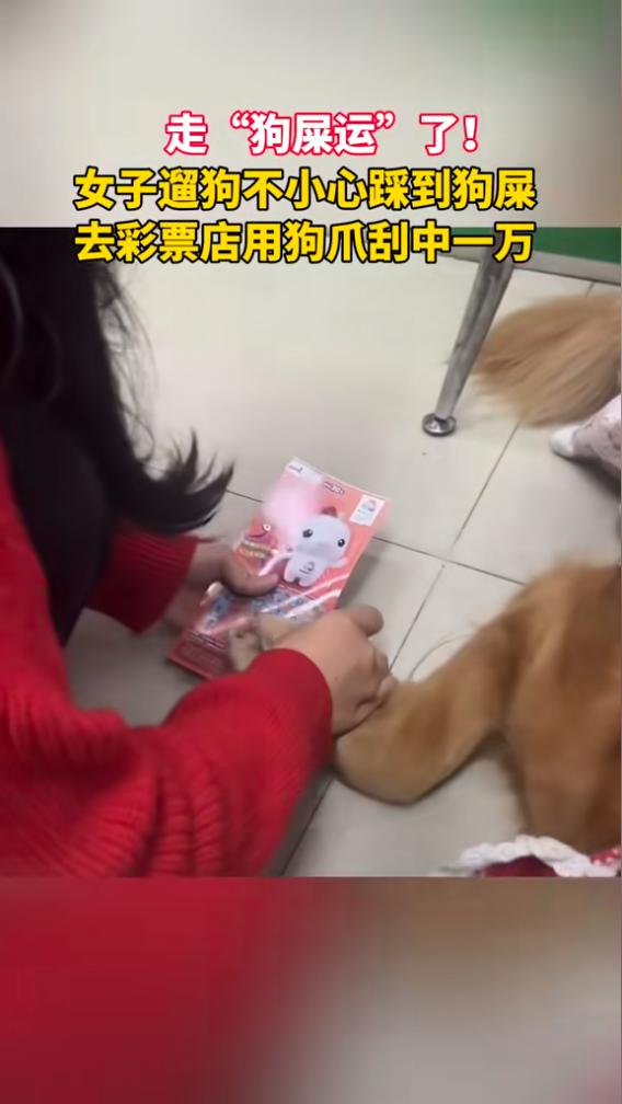 这是真的“狗屎运”!近日,广东深圳,一女子遛狗时,不小心踩到了狗屎,于是就想去彩票店碰碰运气,花了20元买了一张彩票,觉得好玩索性让自家狗用爪子帮忙刮奖,没想到竟然刮出来了10000元!网友:必须给狗狗买大骨头!   事情就发生在深圳一个普通的傍晚,上班族吴女士像往常一样,牵着自家金毛犬旺财在小区附近散步。走着走着,她正低头刷着手机,脚下突然传来一阵软乎乎的触感,低头一看瞬间懵了。 好好的运动鞋上,沾了一大坨狗屎。原本轻松的心情瞬间跌到谷底,她赶紧找了处草丛,费劲地清理了半天,脸上满是无奈。 巧的是,这时同样出来遛狗的好友刚好路过,看到她这副狼狈模样,忍不住打趣说,都说踩狗屎是要走好运的兆头,不如顺道去彩票店碰碰运气,说不定能中个大奖转运。 吴女士本就没把这话当真,只当是朋友安慰自己的玩笑话。可清理完鞋子,想着反正顺路,加上心里确实有点郁闷想找个乐子,便真的带着旺财拐进了街角的彩票店。 她在柜台前看了看,选了一张 20 元的刮刮乐,这是她平时偶尔会买的彩种,图的就是即时开奖的新鲜感。 拿着彩票准备刮开时,她突然想起朋友说的 “狗屎运”,又看了看身边摇着尾巴的旺财,灵机一动有了个好玩的想法:既然是沾了狗的 “光”,不如就让这只小狗来亲手刮开,权当拍个视频发朋友圈逗大家一乐。 她蹲下身,把彩票平铺在地上,轻轻拿起旺财的爪子,在彩票的涂层上慢慢刮了起来。金毛似乎也觉得有趣,配合着主人的动作,小爪子一下下划过纸面,涂层下的数字和图案一点点显露出来。 吴女士一边刮一边笑着和老板闲聊,说自己就是图个好玩,压根没指望真能中奖。可越刮到后面,她的笑容越僵住,当最后几个数字清晰呈现时,她整个人都愣住了 —— 彩票上赫然显示着一万元的中奖金额。 彩票店老板凑过来一看,也跟着吃了一惊,连连表示自己开了快十年彩票店,见过各种各样的刮奖方式,用狗爪子刮中万元大奖的,还是头一回遇到。 老板赶紧拿出兑奖设备核对,确认无误后,当场就帮吴女士办理了兑奖手续。拿着到手的奖金,吴女士还有点不敢相信这是真的,反复确认了好几遍,才反应过来自己真的走了回大运。 其实这已经不是旺财第一次帮主人刮彩票了,一年前吴女士就曾让它试过一次,当时还中了 50 元的小奖,只是那次没太当回事。这次能中万元大奖,纯属意外之喜。 吴女士当天晚上就兑现了 “奖励”,给旺财买了最喜欢的宠物蛋糕和奶酪棒,看着狗狗吃得津津有味,她觉得这份好运来得格外暖心。她把这段用狗爪刮奖中奖的视频发到网上后,很快就引发了网友的热议。 有网友调侃说,这才是真正的 “狗屎运”,建议大家以后踩了狗屎别生气,赶紧去买彩票。也有网友羡慕不已,说自己买了好几年彩票都没中过超过 10 元的,没想到一只小狗随手一刮就中了大奖。 还有不少养宠物的网友表示,回头也要让自家宠物试试手气,说不定也能沾到好运。不过也有理性的网友提到,刮刮乐的中奖率虽然不算特别低,普遍在 20%-35% 之间,但中万元这种较高金额奖项的概率其实并不高,吴女士的经历更多还是巧合。 对此,你们有什么看法,欢迎评论留言~