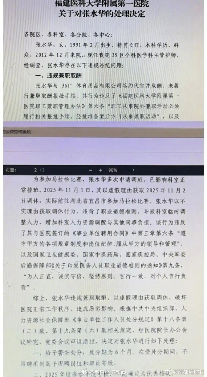 【#医院证实最快女护士张水华被警告处分#】#最快女护士被指以虚假理由获得调休# 12月9日晚,有跑友公开一份福建医科大学附属第一医院的内部通报,文件标题是《福建医科大学附属第一医院关于对张水华的处理决定》,该文件指出张水华存在违规兼职取酬、以虚假理由获得调休的行为,被医院警告处分6个月,并不能参与2025年评优。#医院回应最快女护士张水华被处分#文件中列出了处罚原因:一是违规兼职取酬:张水华与361°体育用品有限公司签约代言并取酬,未履行兼职取酬报批手续,违反了《福建医科大学附属第一医院职工兼职管理办法》。二是以虚假理由获取调休:为参加马拉松比赛,张水华多次申请调班,已影响科室正常排班。2025年11月1日,其以虚假理由获取2025年11月2日调休,实际前往湖北省宜昌市参加马拉松比赛。张水华以不实理由获取调休行为,违背了职业道德准则,导致科室临时调整人力,增加科室人力资源调配与其他同事负担。该行为违反了其与医院签订的《事业单位聘用合同》的相关条款。医院认为,张水华违规兼职取酬、以虚假理由获得调休,破坏了医院的正常工作秩序,并造成了恶劣的影响。医院经研究决定,对其给予警告处分,为期6个月,期间不得聘用到高于现在岗位和职员的等级。二是2025年度的考核,不能参与评优。12月10日,极目新闻记者从福建医科大学附属第一医院获悉,该通报属实。(极目新闻)
