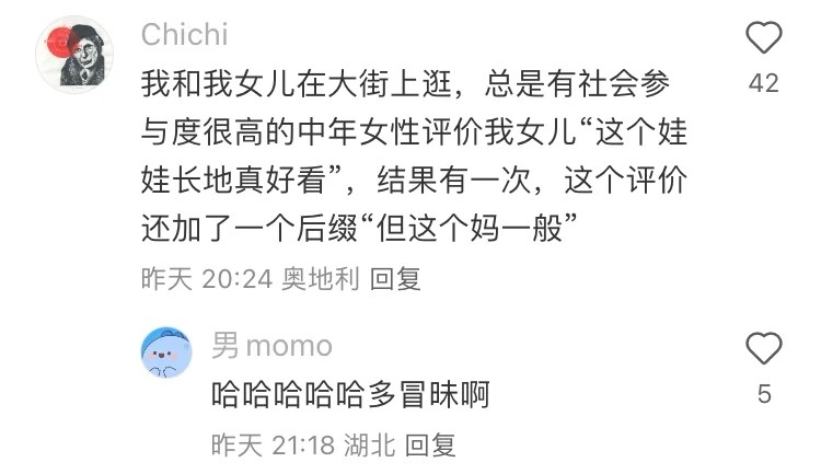 我和我女儿在大街上逛,总是有中年女性评价我女儿“这个娃娃长地真好看”,结果有一次,这个评价还加了一个后缀“但这个妈”