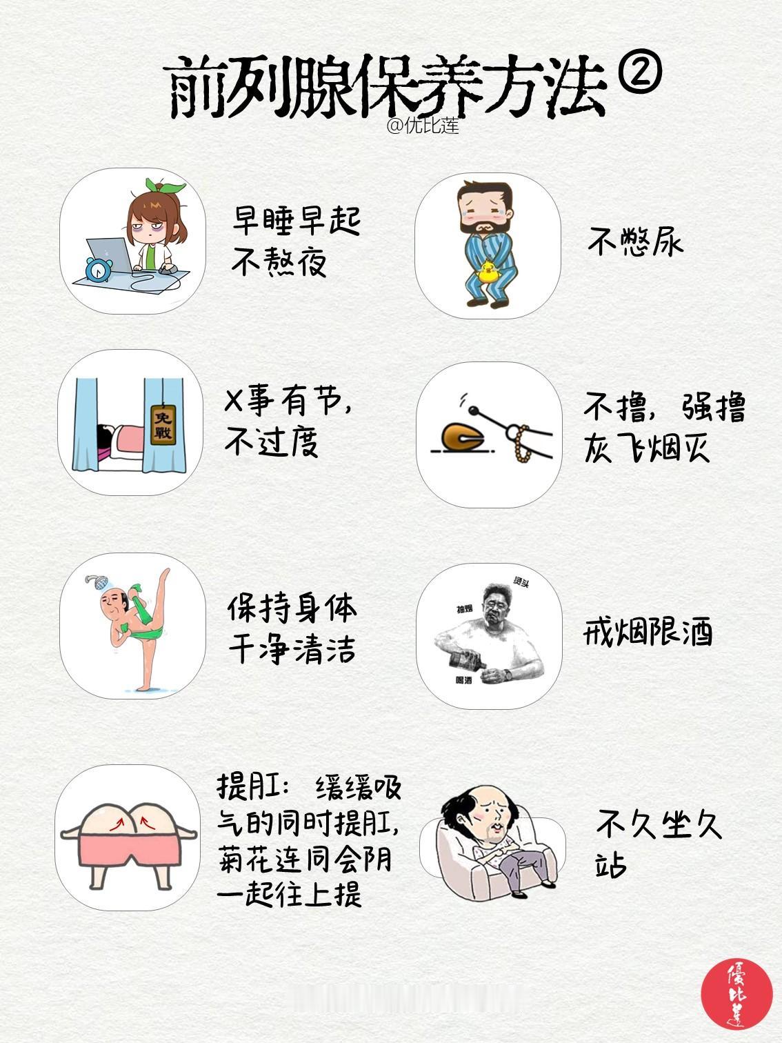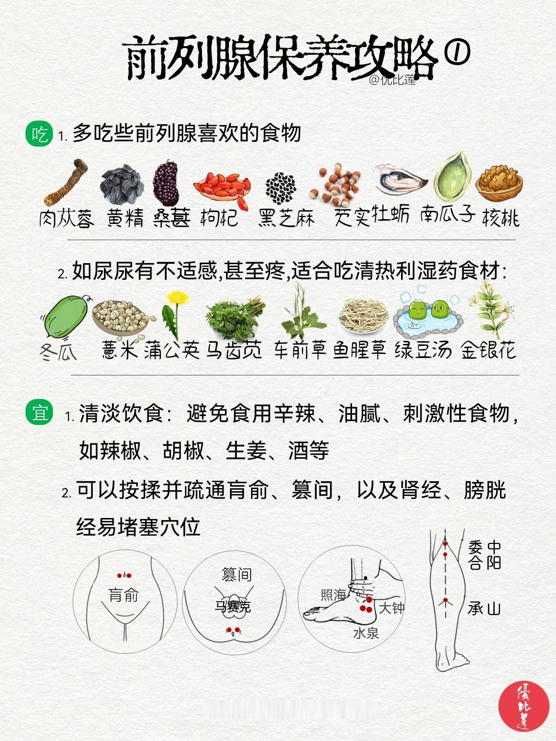男人,请务必保护好你的前列腺! 前列腺,就像是水库的大坝水闸一样,负责泌尿与生殖之精的开和关,开则排泄畅快无阻,关则封藏固摄,滴水不漏。 中医里,前列腺属生殖,主要归肾和膀胱管,如肾和膀胱异常,则会泌尿与生殖方面出现异常,该通畅时不通畅,该封藏时却固摄不住~ 养生调理方法: 1、多吃些前列腺喜欢的食物 2、如前列腺位置出现不适感,适合的养生食材: 3、清淡饮食:避免食用辛辣、油腻、刺激性食物,如辣椒、胡椒、生姜、酒等 4、前列腺,属生殖,归肾管,可以按揉并疏通肓俞、篡间,以及肾经、膀胱经易堵塞穴位 5、早睡早起不熬夜 6、不憋尿 7、X事有节,不过度 8、不撸,强撸灰飞烟灭 9、保持身体干净清洁 10、戒烟限酒 11、提肛:缓缓吸气的同时提肛,菊花连同会阴一起往上提 12、不久坐久站 前列腺好,逆风尿三丈; 前列腺差,顺风尿湿鞋!