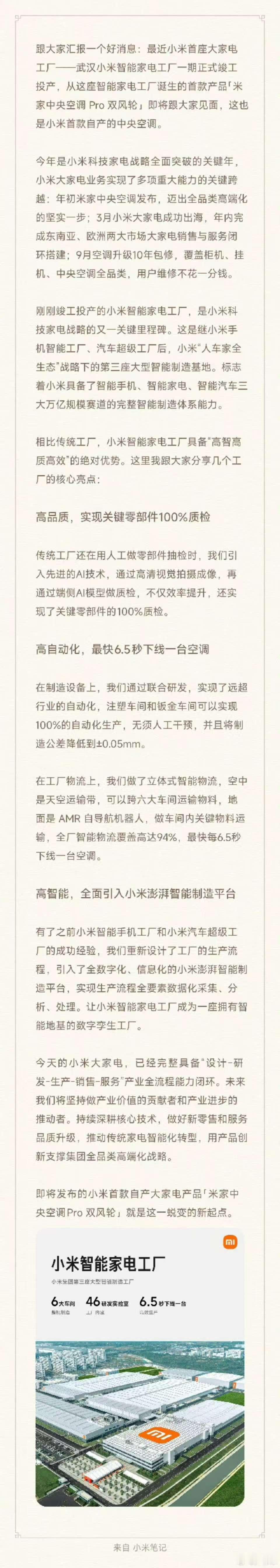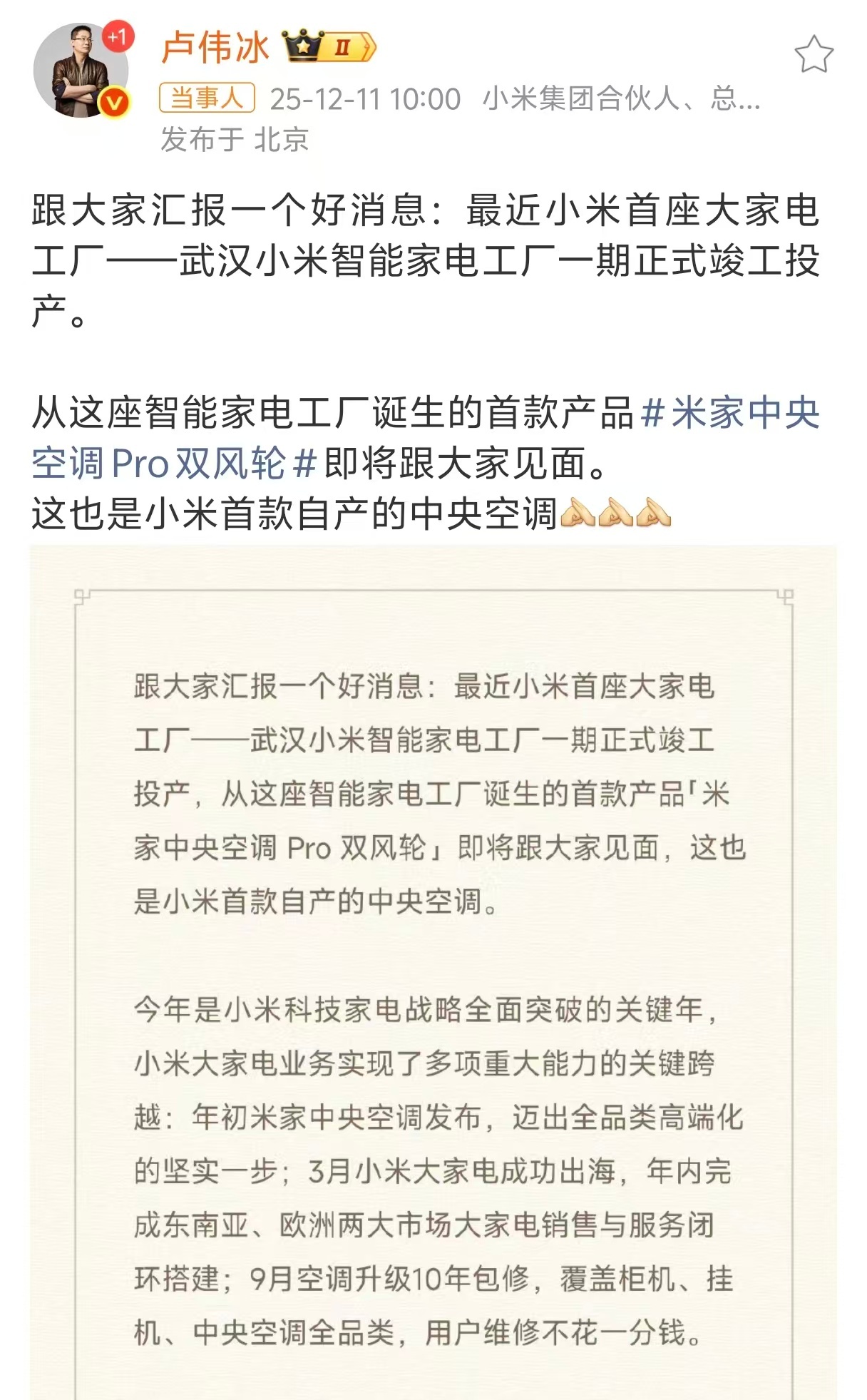 小米手机早就不只是个通讯工具,它是整个“人车家”生态的超级大脑。 小米汽车不只是个代步工具,而是你真正的“智能战友”。 小米的智能家居,堪称“家务小能手+贴心管家”的结合体。小米做的不是单品,而是全屋智能互联。你可以通过手机、语音,甚至是小米汽车远程控制家里的电器,真正做到“人在路上,家已就绪”。 这些都能充分说明,小米的三大赛道都能做到均衡发展。卢伟冰宣布小米将发布自产中央空调
