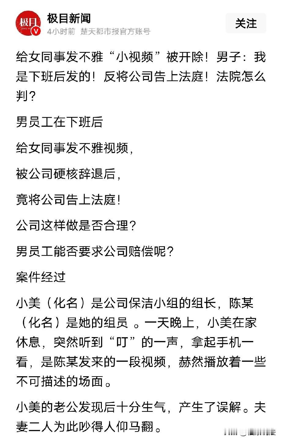 女子是公司保洁小组组长,一天晚上,她手下的男员工发来一段视频,女子打开一看画面不可描述,十分不雅,不巧,女子老公刚好看到,两人吵的人仰马翻,女子越想越气投诉到公司,还报了警,公司查明原因后,认为男子违反公司规定,将他开除。男子不服气,说自己下班发的,属于个人私生活,公司无权过问,更不能开除他。随即申请劳动仲裁,结果被驳回,男子又把公司告上法院,要求赔偿,法院判决让他始料未及。 小美(化名)是公司保洁小组组长,日常工作认真负责,和组员们相处的也挺好,可是,她没想到其中一个男组员陈某(化名)不是个正经人,给她惹来了大麻烦…… 某天,小美像往常一样下班,结束了一天的工作后,她瘫在沙发上休息,突然,手机响了一声,她拿起来想看看别是有什么重要的事。 当她打开手机一看是组员陈某发来的消息,是一段视频。 小美没多想,就点开视频,万万没想到,画面中赫然播放着一些不堪入目、不可描述的场面。 这突如其来的画面冲击,着实惊到了小美,一时间不知所措,她怎么也没想到陈某竟然是这种人。 不巧的是,小美的老公恰巧在一旁看到了这段不雅小视频。 作为丈夫,他顿时怒火中烧,误以为小美背着自己在外面和别的男人暧昧,屈辱感一下涌上来。 夫妻俩因为这小视频吵的不可开交,小美越是极力解释,丈夫越是觉得她心虚,两人这下彻底误会了,吵的人仰马翻。 小美越想越气,又羞又恼,她没想到一段不雅小视频给自己带来这么大的麻烦,让自己的丈夫误会如此之深,真是解释不清了。 不过,小美没有为此隐忍,她觉得始作俑者就是陈某,必须给他点教训,便去公司进行了投诉,详细的讲述了事情的经过,希望公司能介入处理,还自己一个公道。 同时,小美也果断的报了警。 小美深知这件事不弄明白,自己和丈夫的日子都过不下去了,而且,对自己的名声也是不小的影响。 谁能想到,陈某还是一个无赖,面对警方的询问,他还狡辩说是朋友拿他手机玩,不小心误发了视频。 可是,他的说法漏洞百出,难以自圆其说。 在进一步的追问下,陈某最终难以抵赖,不得不承认自己的错误行为,给小美写下了保证书,希望小美原谅他。 然而,事情并没有结束,公司接到小美的投诉后,很重视,一番详细的调查,结合相关证据,公司认为陈某的行为严重违反了公司的规章制度。 而且,公司此前就《员工手册》对陈某进行了公示,陈某经过培训,没有提出异议。 在《员工手册》中,明确规定了对于侵犯同事权益、影响工作秩序等严重违纪行为的处罚措施。 公司认为,陈某向小美发送不雅视频,侵犯了小美的劳动权利,影响了小美工作情绪和状态。 依据《员工手册》的相关规定,公司向陈某出具了《惩戒通知书》,最后将陈某开除。 陈某收到《惩戒通知书》后,心里十分不服气,他觉得事情发生的时间又不是上班时间,公司没有权利过问这件事。更不应该把自己开除。 为了维护自己的权益,陈某先去申请了劳动仲裁,希望能够推翻公司的解雇决定,并获得相应赔偿。 结果并未如他所愿,他的请求被驳回了。 陈某并不觉得这件事有什么严重的,他没有就此罢休,又将公司告上法院,认为公司解除劳动关系是违法的,要求公司赔偿以及其他费用。 陈某给已婚女同事发不雅视频,引起人家的家庭矛盾,他的行为给女同事带来不好的影响,此等做法确实不地道。 然而,丢了工作后,陈某急了,那么,他的要求会得到法院支持吗? 《劳动合同法》第39条规定:劳动者严重违反用人单位的规章制度的,用人单位可以解除劳动合同。 本案中,公司通过《员工手册》明确禁止性骚扰行为,并已向陈某公示且培训,陈某未提出异议,该手册可作为管理依据。 陈某向女同事小美发送不雅视频的行为构成性骚扰,不仅违反公序良俗,还对小美的心理、家庭及工作造成严重负面影响。 公司依据《员工手册》解除劳动关系,符合“严重违纪”的法定解除条件,程序合法。 陈某认为,他发视频是下班时间,公司开除自己属于违法行为,法院会怎么认定? 《民法典》第1010条规定:性骚扰的认定不局限于劳动场所,而是以行为性质为核心,包括任何以言语、文字、图像等方式侵犯他人人格尊严的行为。 法院认为,陈某确实是下班后给小美发的视频,但是,小美是公司员工,也是他的同事。 而且,陈某这么做导致小美被丈夫误会,引发家庭矛盾,对小美的工作和生活都造成了困扰。 这样下去,会影响员工的情绪,导致工作效率下降,另外也会导致风气不正等情况。 因此,法院认定公司以陈某违纪为由解除劳动关系,合理合法。 最终,法院判决:驳回陈某的诉讼请求。 陈某最终为自己的不良行为付出了惨痛代价,所以,不该发的视频别乱发,不仅违法也会给自己或他人造成不好的后果。