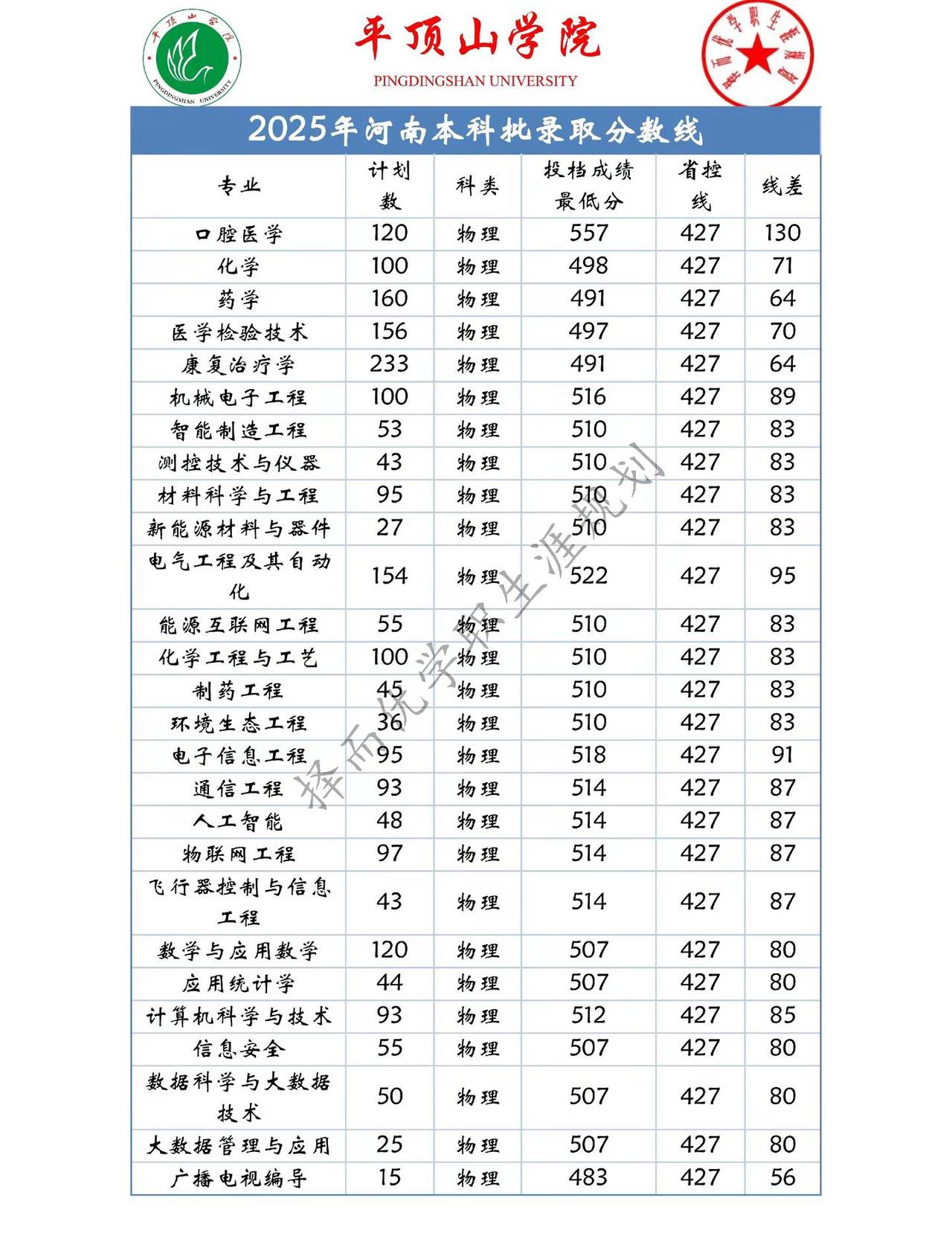 2025平顶山学院在河南各专业招生情况。物理组:招生最高分数的为口腔医学,线差为130分,其次为电气工程及其自动化,线差为95分。历史组最高分数为法学80分,其次为汉语言、会计,分别为60分、59分。平顶山学院 河南高考