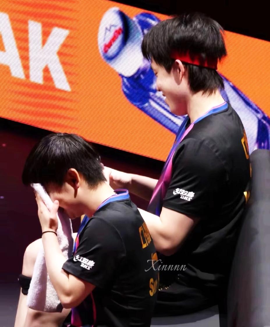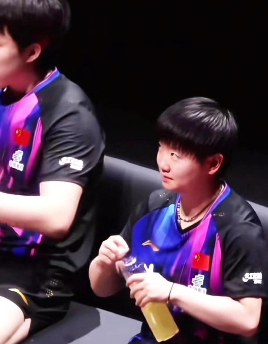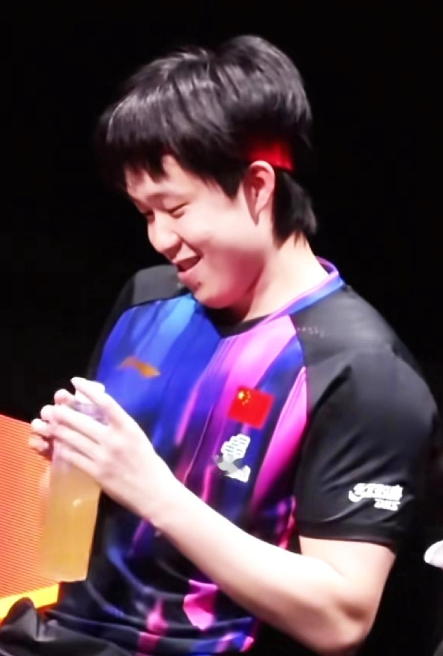 果然这两人不能对视一眼, 一对视就笑场, 这是彻底憋不住了。 混双内战真是欢乐多, 莎头组合对战动漫组合。 第一局局间休息, 莎头一本正经地喝水, 表情严肃, 一句话也没有交流, 也不知道他们怎么能憋住。 当动漫组合叫了一个暂停, 他俩来到场外休息, 对视了一下, 这下可憋不住了。 一个明着笑, 一个用毛巾捂脸笑。 原来他俩看到, 石头和大丫头在商量战术, 怎么对付哥哥姐姐。 看到这个画面, 他俩彻底是憋不住了, 颧骨上扬笑得那叫一个开心。 网友们调侃, 一个明着笑, 一个偷着笑, 一群人隔着屏幕笑。 喜欢他们就是, 他们笑我们一起笑, 他们难过我们一起难过。 (图片源自于网络)
