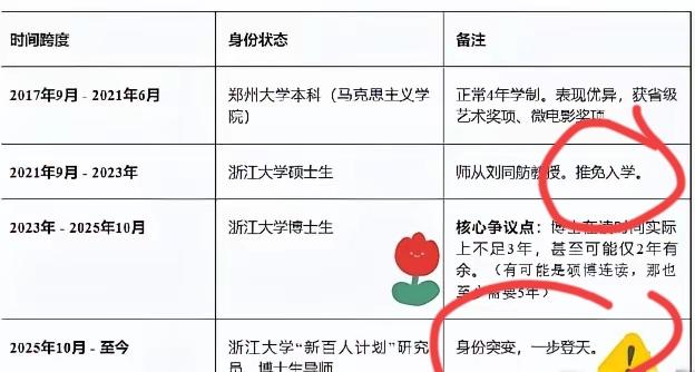 浙大26岁博导履历被扒个底朝天! 看完我直接没绷住。 谁能想到,能坐浙大博导位置的人,高考分数竟没有优势! 闵超博导高考成绩是550分,按照河南省地方专项录取政策,低于普通本科批次50分的水平招生录取到郑大。 当年郑大文科普通批次录取线625分。550分也就是二本的水平!没关系550分是上不了郑大的,当年我朋友儿上郑大是599分! 后来读研,又走的推免入学,也就是说研究生是根本考不上浙大,是靠别人推免! 这到底是不拘一格降人才,还是学历通胀的闹剧? 这二本水平,靠着政策和推免,一路到了顶尖学府的博导,这剧情比电视剧还魔幻! 浙大博导 博导 青年博导 高校博导 大学博导