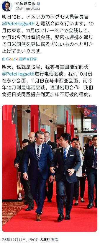日本防卫大臣小泉进次郎12月11日晚发文写道:“明天,也就是12号,我将与美国战争部长赫格塞斯进行电话会谈。我们10月份在东京会面,11月份在马来西亚会面,而今年12月则是电话会谈。通过密切合作,我们将把日美同盟提升到更加牢不可破的程度。” 小泉进次郎又在社交媒体上“晒”同盟了。从东京会面到马来西亚碰面,再到这次电话会谈,日本防卫大臣的行程表恨不得每一页都印着“日美同盟”四个字。 可明眼人都知道,这通电话里的“密切合作”,大概率还是老剧本,日本抱怨中国军舰的火控雷达,美国象征性安抚两句,末了再催缴新一轮“保护费”。 这种“按月打卡”的同盟秀,早把日本的焦虑写在脸上。去年特朗普一句“盟友不是朋友”,至今让东京脊背发凉。 还记得2025年夏天的5500亿美元投资协议吗?日本咬着牙把真金白银砸进美国基建,换来的却是白宫一句“钱归我们,怎么用我说了算”。 当时舆论都说,这哪是同盟投资,分明是黑社会收保护费,交钱时笑脸相迎,出事时躲在幕后。 美国的算盘从来打得精。俄乌冲突时,日本跟着制裁俄罗斯、援乌76亿美元,结果呢?美军舰机在台海周边遇中国海军直接退避三舍,反倒是日本自卫队被推到钓鱼岛前线玩“雷达对峙”。 现在台海风声紧,美国更是把“台湾有事即日本有事”的口号塞给日本,自己却连“是否出兵”的承诺都留着尾巴。 说白了,美国要的是日本当亚太的“乌克兰”,用本土列岛当炮灰缓冲区,自己隔着太平洋卖军火、赚投资。 日本不是没算过账。2023年部署“堤丰”导弹时,冲绳民众抗议到堵路,因为都知道这玩意儿是给美军当靶子的。 去年防卫费涨到GDP2%,相当于每年多掏2000亿人民币,其中60%都买了美制武器。 前首相石破茂说“不能卖尊严换安全”,可现实是,日本连美军基地的治外法权都改不了,驻日美军强奸冲绳女性,最后还是美国法庭轻判释放。这种同盟,到底保护谁的安全? 最讽刺的是,日本越讨好,美国越拿捏。2025年初的钢铁收购案,拜登直接否决日企收购美钢,理由是“威胁国家安全”。 可转头就批准英国公司收购,因为人家是“五眼联盟”自己人。日本折腾几十年想进“五眼”,结果连CFIUS审查的白名单都进不去,在华盛顿眼里,终究是“非我族类”的工具人。 小泉进次郎们不愿承认的是,日美同盟的底色从来不是“信任”,而是交易。美国要的是前沿炮灰、市场韭菜、军售客户,日本换的是虚幻的安全感和大国幻觉。 当年特朗普威胁撕毁安保条约,现在拜登照样在经贸上捅刀,本质都是“美国优先”的生意经。 当日本在台海问题上替美国站台时,华盛顿的智囊团正忙着推演:如果冲突爆发,如何让日本自卫队先消耗中国军力,美军再伺机介入,这种“同盟情谊”,细思极恐。 深夜的电话会谈,小泉或许会再次听到美方“坚定支持”的承诺,但话筒另一端,大概率还摆着下一份军购清单、下一轮关税谈判的备忘录。 日本越是把同盟吹成“牢不可破”,越暴露其战略上的无依无靠。毕竟真正的盟友,不会让你在前线流血,自己在后方数钱,这道理,看看乌克兰就懂了。