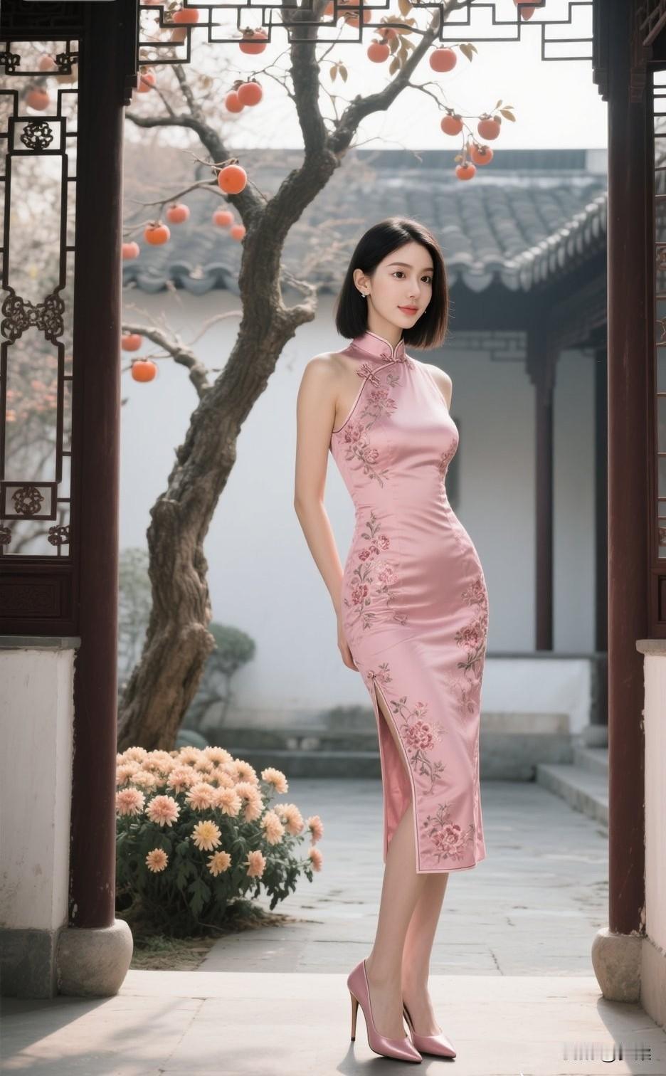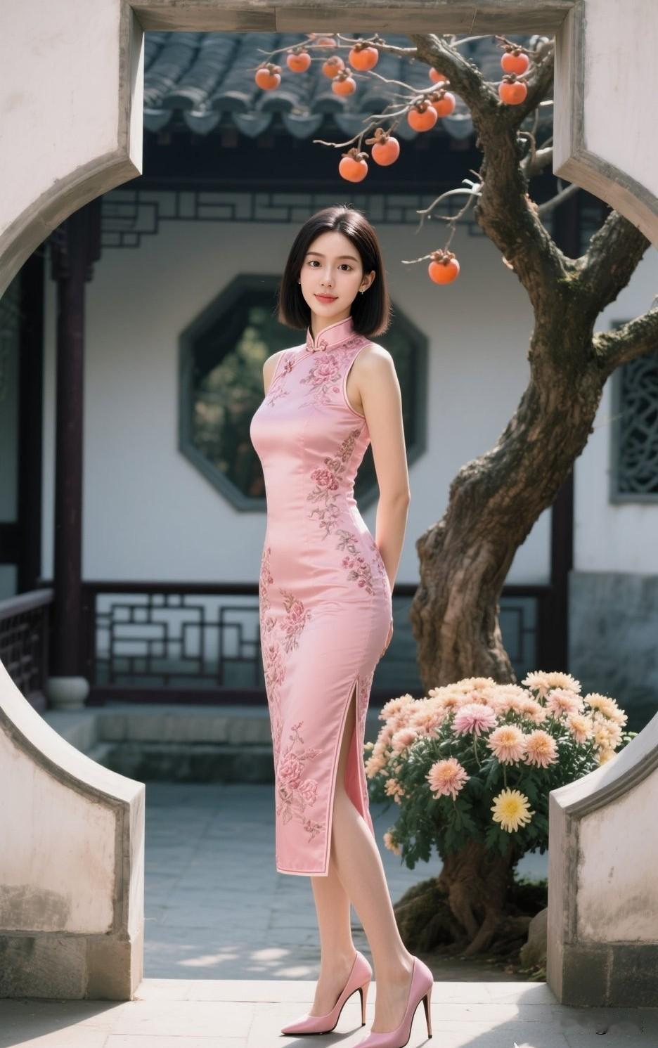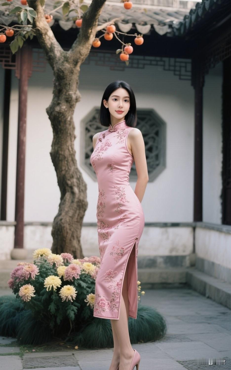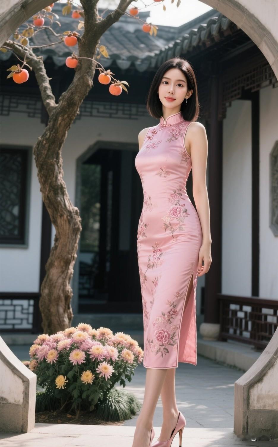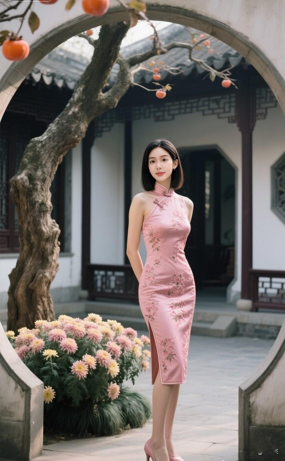 温柔笑颜,粉色旗袍,优雅气质,尽显东方美。