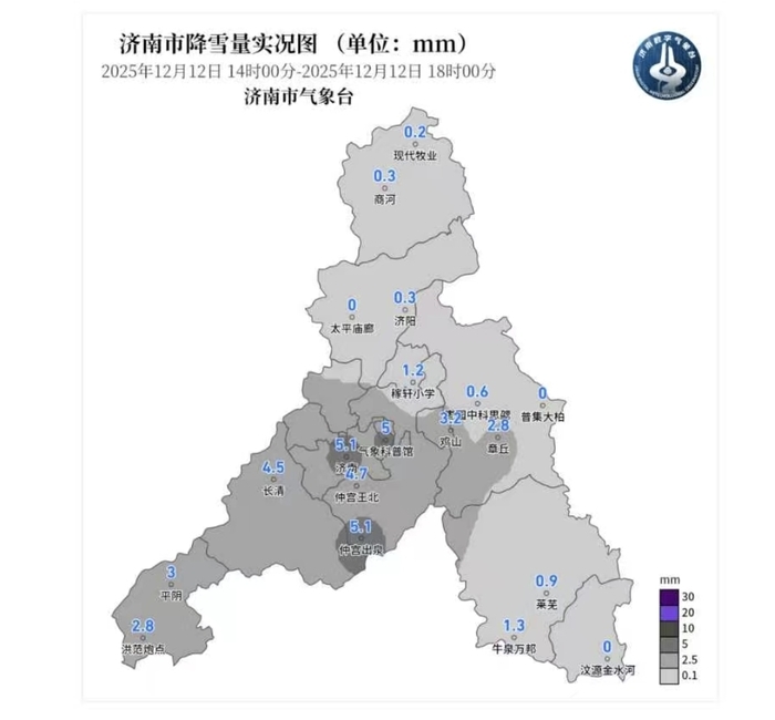 雪继续下,济南市气象台最新统计,12月12日14时至12日18时降水量为1.9毫米,折合水量约0.19亿立方米,市区5.1毫米,长清区4.4毫米,平阴县2.9毫米,济阳区0.3毫米,商河县0.2毫米,章丘区0.8毫米,莱芜区0.7毫米,南山区4.7毫米,历城区2.5毫米,高新区2.2毫米,其他区县尚无记录。