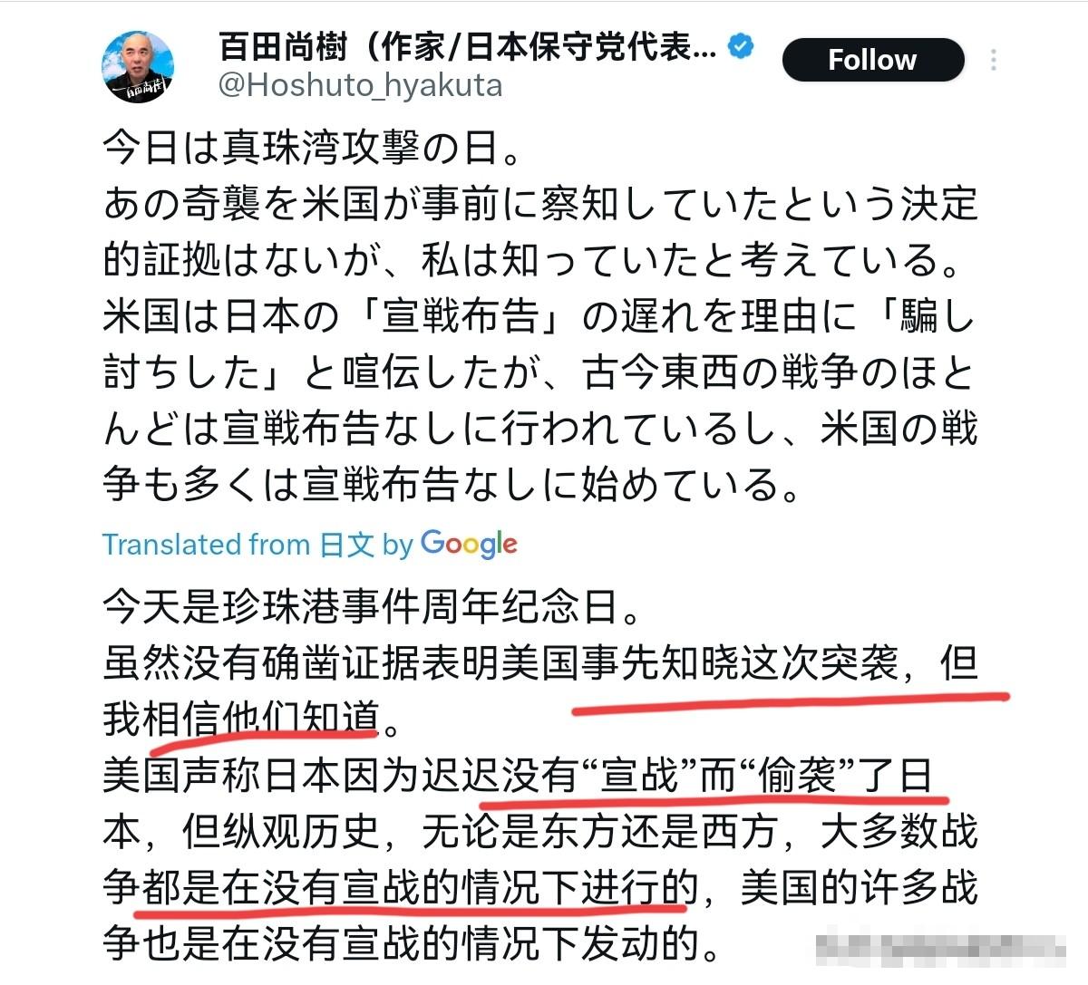 日本开始翻案了!12月8日,日本作家百田尚树公开表示,今天是珍珠港事件纪念日。虽然没有确凿证据证明美国事先察觉了那次奇袭,但我就是觉得他们早就知道了。美国拿日本“宣战公告延迟”当借口,大肆宣扬日本“不宣而战、搞偷袭”,可古今中外的战争大多是没宣战就开打,美国自己发动的战争也好多是不宣而战的。 (阅读前请点个赞,点个关注,主页有更多你喜欢看的内容) 这番话简直是右翼分子,精心包装的历史虚无主义谎言,百田尚树这号人物,本身就是靠否认侵略、美化军国主义吃饭的惯犯,他的话连标点符号都不能信。 百田尚树不仅是作家,还是日本右翼的核心旗手,安倍晋三的“密友”,甚至当过NHK经营委员,却屡次发表颠覆历史的荒谬言论。 早在2014年,他就公开宣称“南京大屠杀不存在”,说这是蒋介石的宣传谎言,遭到中国政府强烈抗议和国际社会谴责。 他还辱骂前日本众议院议长土井多贺子是“卖国贼”,叫嚣要“击溃”批评政府的冲绳媒体,甚至发表“女性不该上大学、30岁不生孩子就强制摘子宫”的极端厌女言论,连日本国内都一片哗然。 这样一个毫无底线、三观扭曲的人,跑到珍珠港纪念日上信口雌黄,本质就是借历史事件炒作,继续兜售他的右翼谬论,为日本军国主义招魂。 更讽刺的是,他和同样否认南京大屠杀、称珍珠港事件是“美国阴谋”的日本航空自卫队前最高长官——田母神俊雄,简直是一丘之貉。 两人长期相互站台,可见这种翻案言论,在日本右翼圈子里早已形成抱团之势。 百田尚树最可笑的论调,就是“没有证据但我觉得美国早就知道”,这哪里是讨论历史,分明是撒泼打滚。 主流史学界早有定论,美国国家档案馆、日本防卫省留存的原始档案,还有多国学者的严谨研究都证明,珍珠港事件是日本军国主义精心策划的偷袭行动。 日本联合舰队司令山本五十六亲自制定计划,舰队秘密航行数千海里,就是为了打美国一个措手不及。 美国国会曾多次展开调查,最终结论都是政府事前并未获知具体袭击情报,所谓“美国故意放任”的说法,不过是日本右翼为了洗白罪行编造的阴谋论。 百田尚树自己也承认“没有确凿证据”,却凭着一句“我觉得”就敢颠覆历史,这种毫无逻辑的言论,也就只能骗骗被日本右翼宣传洗脑的人。 至于他说的“不宣而战很常见”,这纯粹是偷换概念、混淆是非。 日本当年可是签署了《海牙第三公约》的,公约明确规定战争必须提前宣战,不宣而战属于非法行为,日本作为签约国,完全清楚这一国际法准则,却蓄意为之。 1941年12月7日,日军偷袭珍珠港的炸弹已经落下,美军士兵伤亡惨重,日本驻美大使馆才慢悠悠地向美国政府递交宣战公告,这种“先打后说”的行径,根本不是什么“宣战延迟”,而是赤裸裸的背信弃义、非法偷袭。 连日本外务省1994年都不得不承认,当时的行为是“日本大使馆的失职”,间接承认了不宣而战的事实。 百田尚树把这种蓄意违法的偷袭,和历史上某些特殊情况下的军事冲突混为一谈,说“古今中外大多如此”,完全无视国际法准则和历史背景的差异,就是想为日本的侵略行为找借口。 至于他抹黑美国的说法,更是典型的转移视线、倒打一耙。 他嘴里所谓的“美国不宣而战”,大概率是指1798年的XYZ事件引发的美法“准战争”,但那次事件是法国先扣押美国近300艘船只,还向美国外交代表团索要巨额贿赂引发的外交冲突。 双方只是在海上发生有限交战,并未爆发全面战争,最后通过条约和平解决,这和日本主动偷袭珍珠港、挑起太平洋战争,造成数千万人死亡的侵略行径,根本没有任何可比性。 百田尚树故意拿两百多年前的外交冲突说事,却对日本在二战中犯下的滔天罪行避而不谈,这种避重就轻的伎俩,骗不了任何了解历史的人。 更讽刺的是,当年日本偷袭珍珠港,直接把原本保持中立的美国拖入二战,加速了自己的战败,杜鲁门总统后来也明确表示,美国使用原子弹的重要原因之一,就是日本在珍珠港的无警告攻击和虐待战俘的行径。 百田尚树的这番言论,绝不是他个人的胡言乱语,而是日本右翼势力系统性否认历史的,又一次公开挑衅。 他们之所以频频在历史问题上翻案,就是想让日本年轻一代忘记侵略历史,摆脱“战争罪责”的束缚,为日本突破战后体制、扩充军备制造舆论。 可历史真相岂能容人随意篡改,珍珠港事件中,2403名美军士兵丧生,1178人受伤,美国太平洋舰队遭到重创,这是铁一般的事实,日本蓄意不宣而战,违反国际法,这是不容辩驳的罪行。 百田尚树之流拿着“没有证据的感觉”当依据,用偷换概念的手段洗白侵略,不仅是对历史的亵渎,更是对战争受害者的伤害。 日本右翼的翻案行径,只会让国际社会更加看清其军国主义复活的危险动向。 历史是最好的教科书,也是最好的清醒剂,日本如果继续在历史问题上执迷不悟,抱着侥幸心理篡改真相、美化侵略,终将遭到历史的惩罚和世界人民的唾弃。