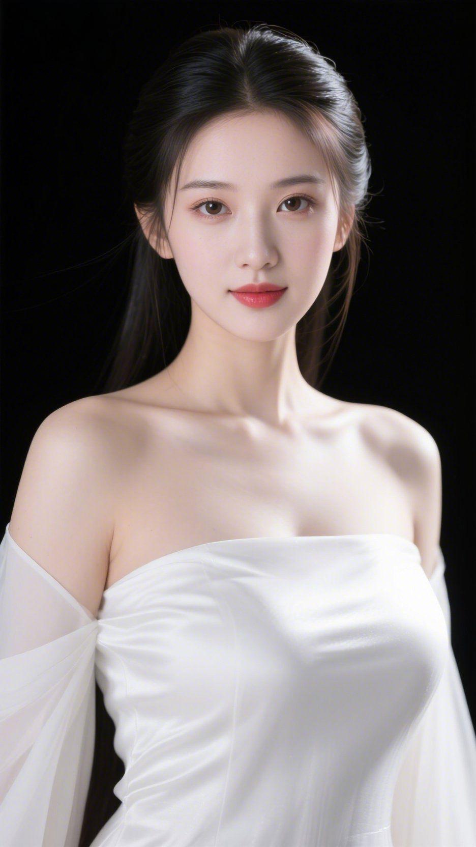 《素衣承光,眉眼清和》 墨色背景里,素白裙衫像揉碎的月光轻落肩头——纱袖舒展垂落,裹着几分柔静,发梢妥帖挽起,几缕碎发轻贴颊边,衬得眉目愈发明净。 她抬眼时,眸光像浸了温玉的光,不艳不灼,却温和落在视线里。没有繁饰堆叠,这抹白成了最妥帖的衬:衬得肩线舒展,衬得神色平和,衬得周遭的暗,都漫开了软意。 原来静敛的美最有温度,是无需声张,就像夜雾里轻浮的星,轻轻浅浅,却让人觉出安稳——是干净,是舒展,是落在时光里的,一点清和的温柔。 素衣静美 眉眼清宁