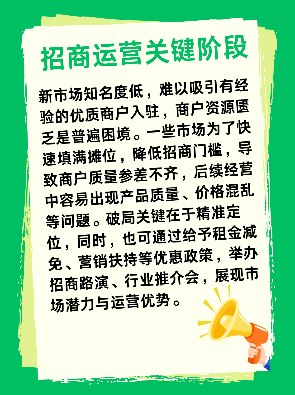 一、前期市场调研工作 二、资金筹备建设方面 三、市场内部规划问题 四、招商运营关键阶段 五、运营管理及营销推广