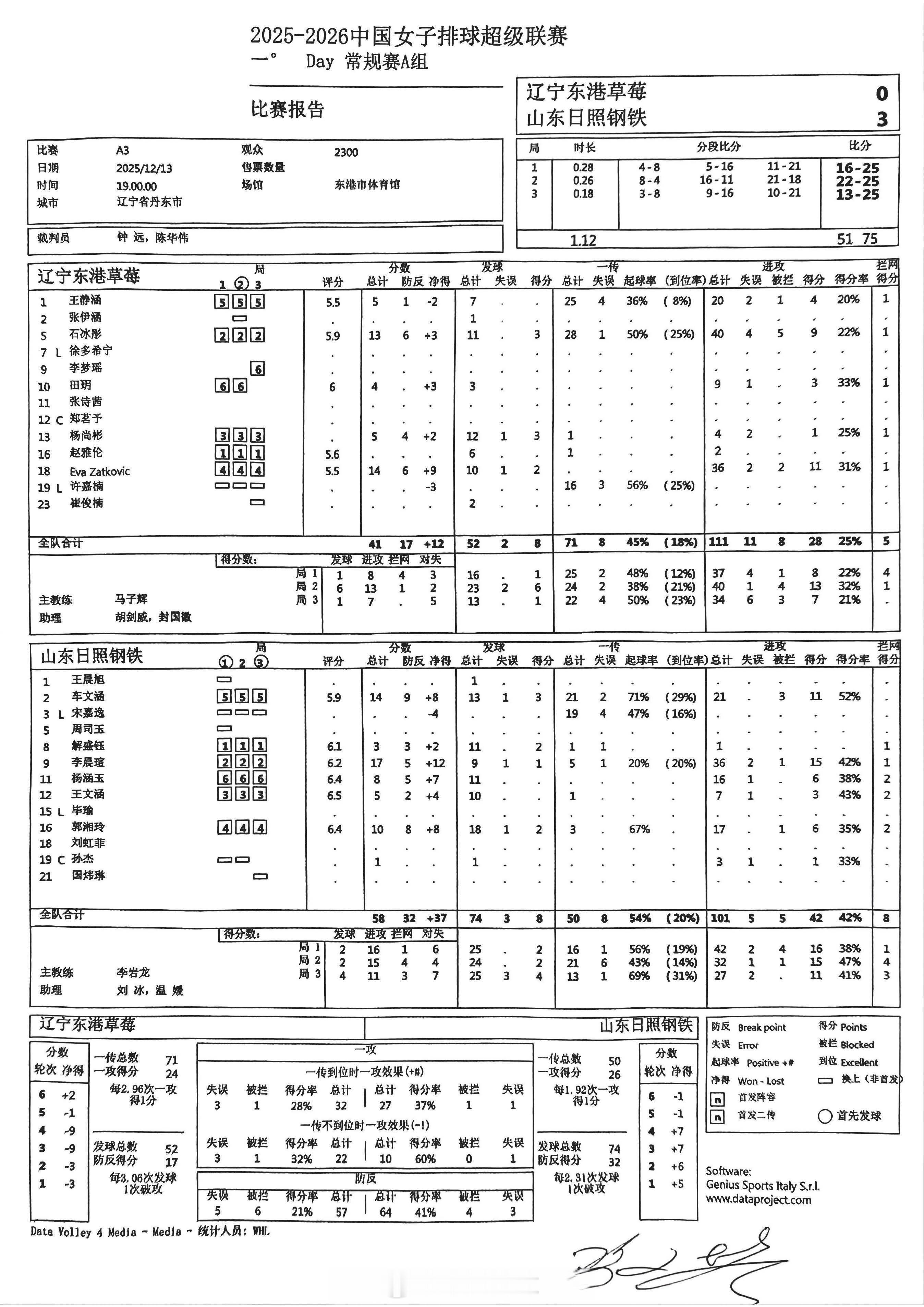 【中国女排超级联赛 常规赛:辽宁0-3山东得分统计】13日晚上,辽宁东港,A级常规赛第1轮,辽宁东港草莓在主场以0-3(16-25, 22-25, 13-25)不敌山东日照钢铁。扎特科维奇14分(36扣11中、拦1发2),石冰彤13分(40扣9中、拦1发3);李晨瑄17分(36扣15中、拦1发1),车文涵14分(21扣11中、发3),郭湘玲10分(17扣6中、拦2发2),杨涵玉8分(16扣6中、拦2)。扣球28-42、拦网5-8、发球8-8、对手失误10-17。