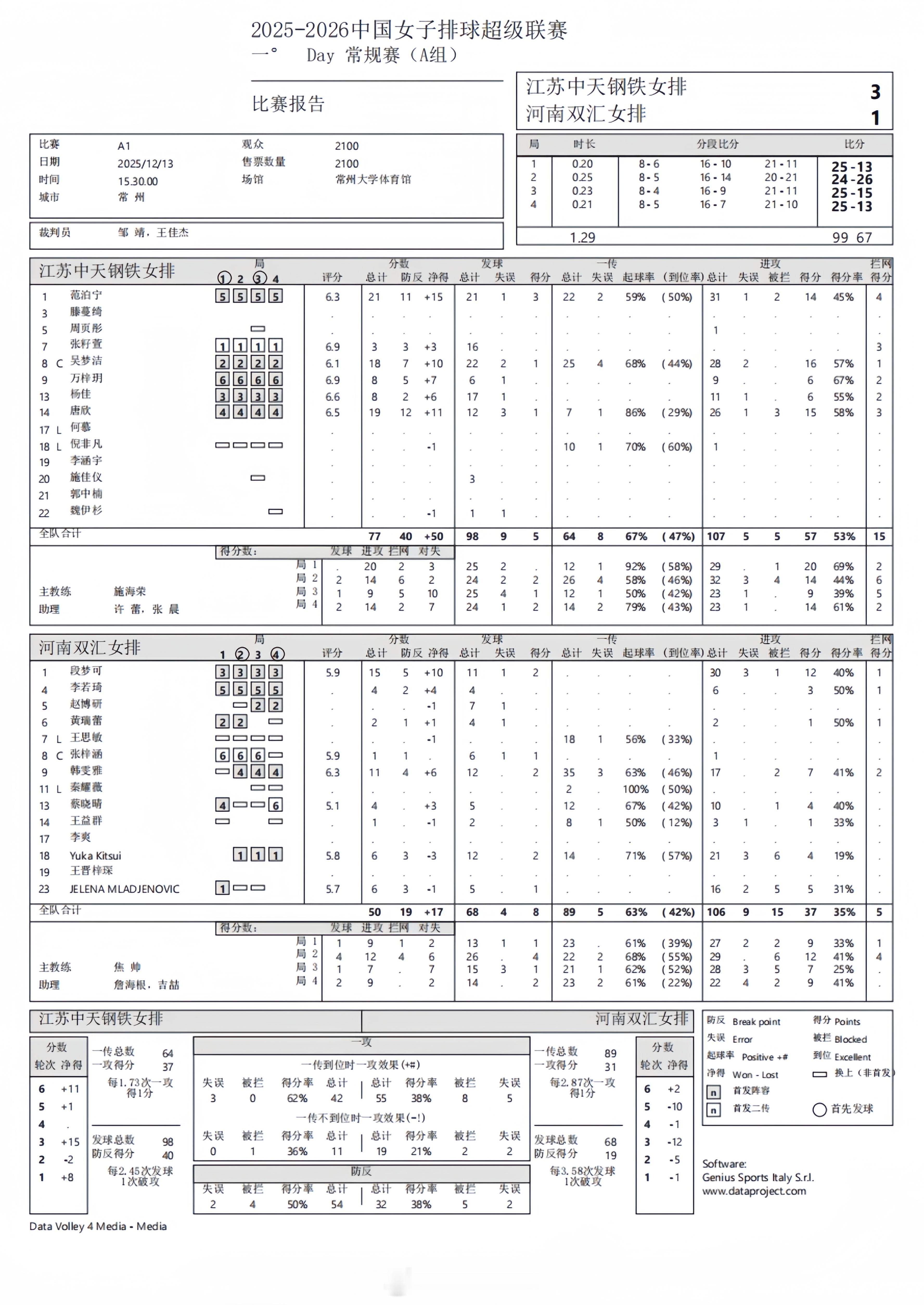 【中国女排超级联赛 常规赛:江苏3-1河南得分统计】13日下午,江苏常州,A级常规赛第1轮,江苏中天钢铁在主场以3-1(25-13, 24-26, 25-15, 25-13)力克河南双汇。范泊宁21分(31扣14中、拦4发3),唐欣19分(26扣15中、拦3发1),吴梦洁18分(28扣16中、拦1发1),万梓玥、杨佳各8分;段梦可15分(30扣12中、拦1发2),韩雯雅11分(17扣7中、拦2发2),橘井友香、姆拉杰诺维奇各6分。扣球57-37、拦网15-5、发球5-8、对手失误22-17。