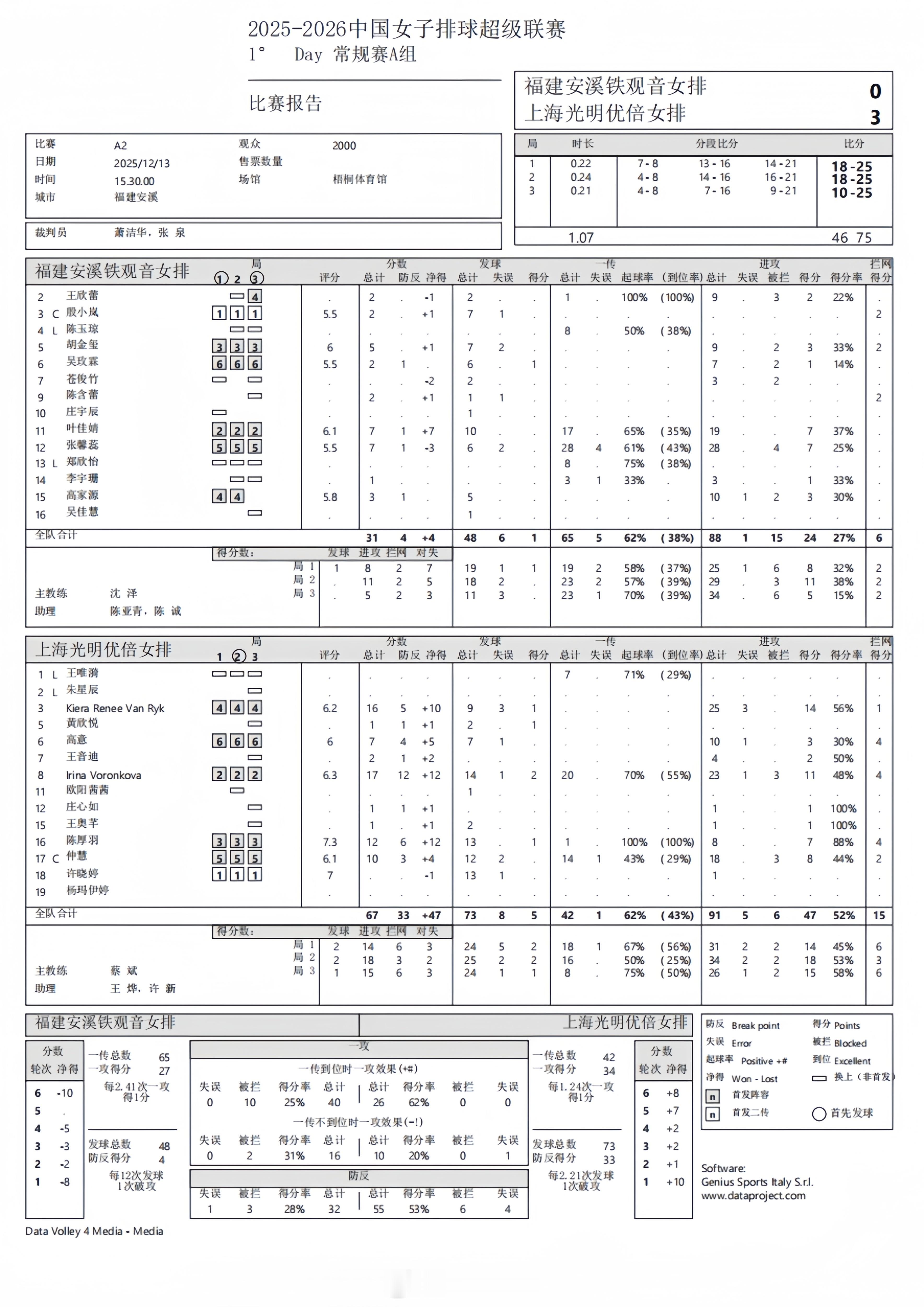 【中国女排超级联赛 常规赛:福建0-3上海得分统计】13日下午,福建泉州,A级常规赛第1轮,福建安溪铁观音以0-3(18-25, 18-25, 10-25)不敌上海光明优倍。叶佳婧、张馨蕊各7分并列队内最高;沃伦科娃17分(23扣11中、拦4发2),范赖克16分(25扣14中、拦1发1),陈厚羽12分(拦4),仲慧10分(18扣8中、拦2),高意7分(拦4)。扣球24-47、拦网6-15、发球1-5、对手失误15-8。