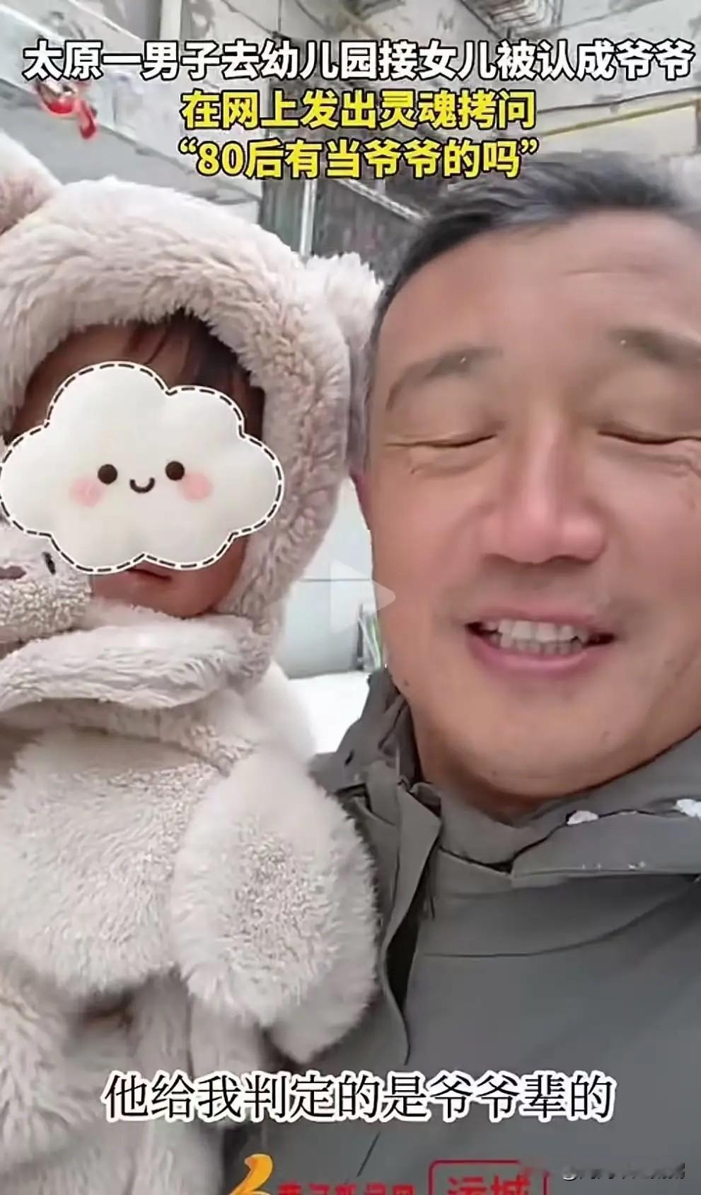 太扎心了!山西太原,81年男子去幼儿园接女儿放学,被认成爷爷。在网上发出灵魂拷问:“80后真的有当爷爷的吗?”网友:80后是个特殊群体,有的还没有结婚,有的孩子还上小学甚至幼儿园,有的已经当爷爷奶奶外公外婆了! 这位81年出生的爸爸,今年不过四十出头。那天和往常一样,他站在幼儿园门口等孩子。可能因为加班多了几根白发,也可能穿着随意了些,旁边一位家长随口对孩子说了句:“看,那个爷爷也来接孙子了。”这句话像根小刺,让他愣了半天。 回家后他对着镜子看了又看,心里五味杂陈。自己明明感觉还是个“年轻人”,怎么在别人眼里就成了“爷爷辈”?他把这段经历发到网上,没想到炸出了大量有类似经历的80后。 有人四十岁的面孔带着五十岁的沧桑,自嘲是“被生活催熟的”。有人的孩子才上小学,参加家长会时却被老师误认为是孩子的爷爷奶奶。 80后最早的一批,如果是二十出头结婚生子,子女又同样早婚,确实是四十多岁就能当上爷爷奶奶,但是更多的人因为读书、工作、打拼,三十多岁才要孩子,孩子自然还在幼儿园。 同一代人人生进度条却各不相同,有人已经抱上孙辈,有人还在辅导小学作业,有人仍在寻找伴侣。 被认成爷爷不只是一个称呼误会,更是这代人在事业、家庭双重压力下的生活写照。熬夜加班、操心孩子、房贷车贷,这些都在脸上悄悄留下了痕迹。 那些沧桑,是奋斗的印记,是扛起责任的勋章,不要管别人叫你什么,你如何看待自己才是你的人生。每个年龄段都有独特的光彩,四十岁有四十岁的从容与力量。 在奔波忙碌的生活里,别忘了对自己好一点,外表年轻几分固然好,但内心的豁达与自信,才是抵御岁月最好的法宝。 各位读者你们怎么看?欢迎在评论区讨论。