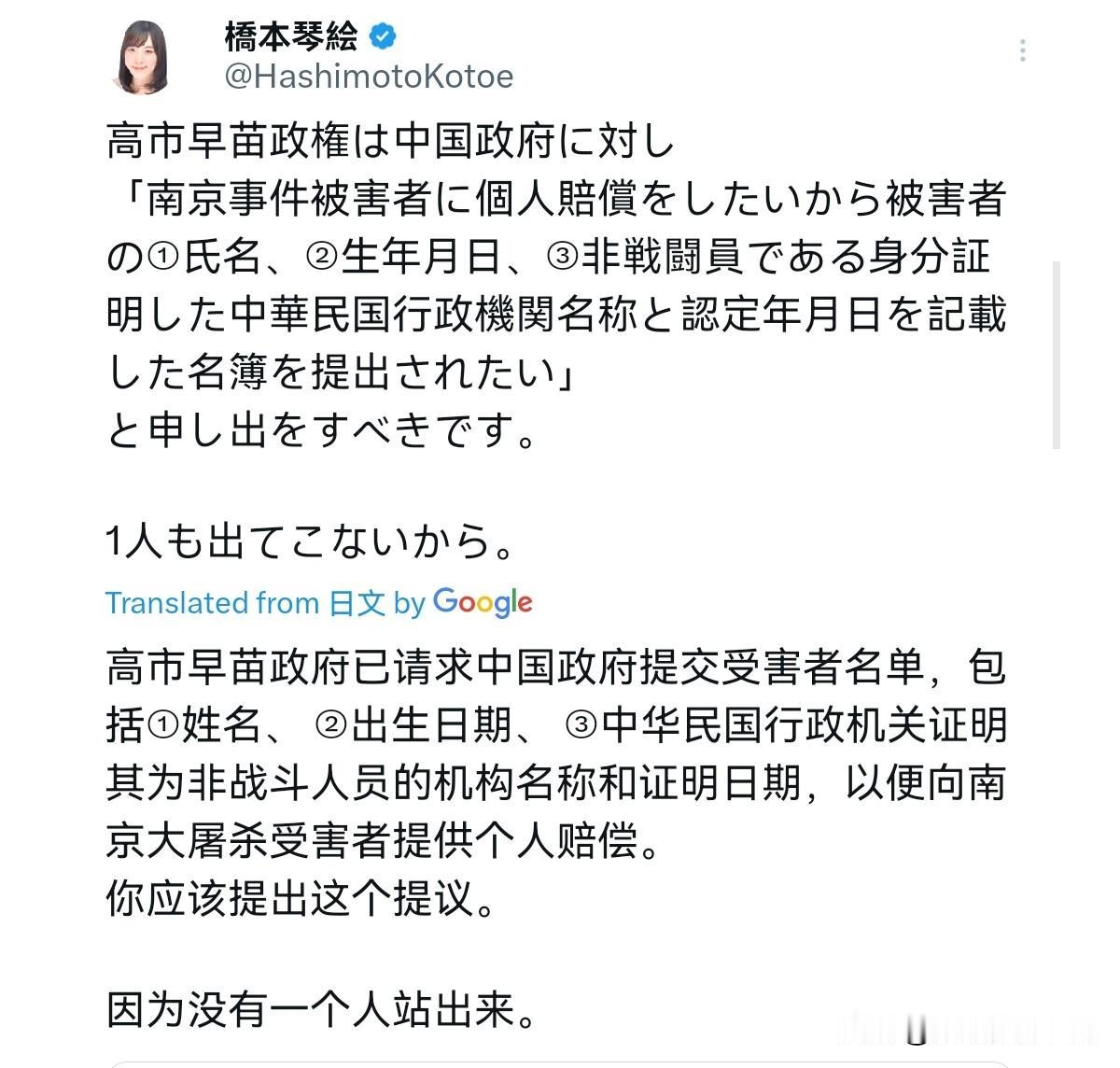 日本极右翼分子桥本琴会表示,中国根本拿不出大屠杀的证据!12月14日,桥本琴会表示,应让高市早苗政权向中国政府提出如下要求:因希望向南京事件受害者进行个人赔偿,恳请贵国提交记载有受害者以下信息的名录:①姓名;②出生日期;③能证明其非战斗人员身份的当年的中华民国行政机关名称及认定日期。 很显然,让我们没想到的是在我们悼念南京大屠杀受害者同胞之际,日本极右翼分子不仅不承认有屠杀的存在,反而还要我们提供当年的受害者名单。为什么日本的右翼分子能够如此的无耻,因为这些卑劣之徒心里面非常清楚,当年日军冲进南京城,见人就杀、见房就烧,机枪扫完活埋,杀完还毁尸灭迹,连幸存者都东躲西藏。 当时的国民政府行政机构早就被日军打垮了,谁能够去做这样的统计核实工作?一头疯狂的野兽冲进瓷器店,在瓷器店被冲的七零八落之后,这头野兽反过来要我们找到每一块被摔得粉碎的碎片,而当我们拿不出每一块瓷片后就声称自己没有犯下罪行,这岂不是极度的无耻。我们确实拿不出精确到个人的详细遇难者名单,但是这并不代表我们没有日军大屠杀的证据。 远东国际军事法庭的判决书、当年留在南京的西方记者日记、日军士兵自己写的家书,哪一样不是证据?再者,战争赔偿本是国家层面的责任,而非所谓“个人赔偿”的闹剧。日本右翼分子如此否定屠杀历史,以如此刁钻的角度逃避责任,甚至为侵略者翻案,但这笔血债我们绝不会忘记。日本右翼分子一面否认历史,一面扩军,妄图干涉我们的内政,这样的疯狂行为最终怕是要把日本引向二次毁灭。
