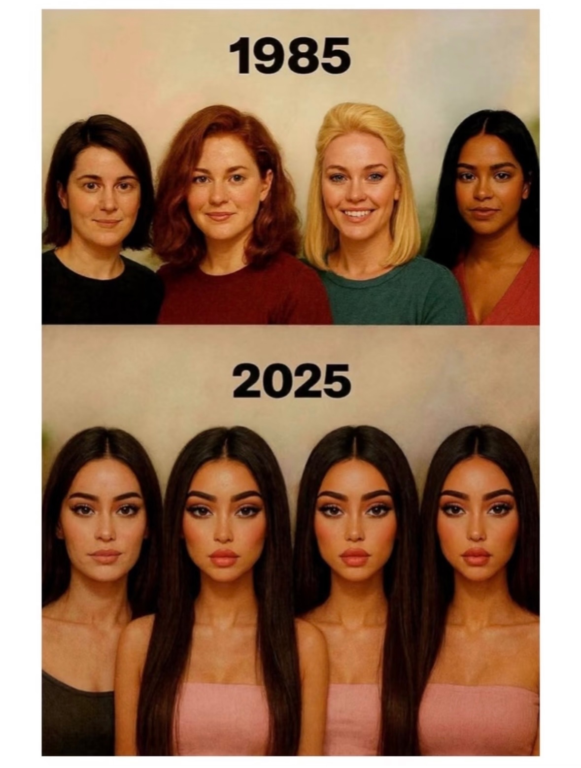 以前审美vs现在审美刷到这三组图,真的被狠狠戳中!不管是女性审美从1985年的风格各异到2025年的“复制粘贴”,还是男性形象从霸气雄狮到带纹身扎丸子头的“潮流狮”,甚至女性审美从50年代的优雅、80年代的活力到2025年的过度模板化,都在呐喊同一个问题:审美什么时候开始变得这么“千篇一律”了?从前的美,是50年代的复古优雅、80年代的热烈张扬、是不同发色不同穿搭的自信绽放;现在的美,却在网红模板、流量趋势里成了“工业流水线产品”。不是说流行风格不好,而是当所有人都朝着同一个模子靠拢,“独特”就成了稀有品。
