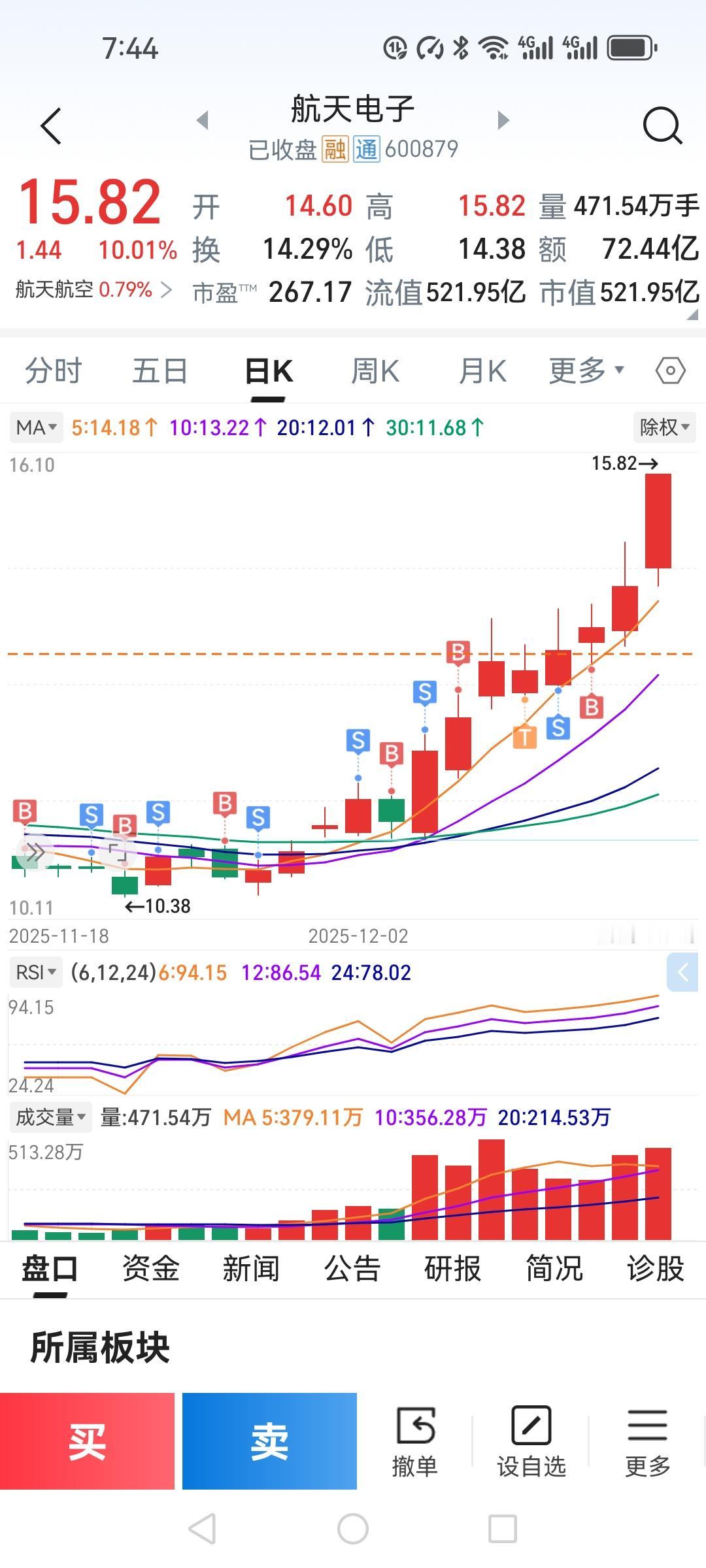 航天电子12月4日,12月10日两次盈利5300多,12月11日又在13.5回调时果断买入。 从航天电子的操作使我体会到,炒股票不能犹豫,一定要跟着趋势走,看准了就要大胆下手,坚决不能犹豫,虽然也有调整,那都是正常的,今天涨到了14.82稳稳的收在涨停板上。现在又浮赢2300多。 现在还是有点后悔,后悔当时胆子还是太小了,买的少了,要是多买点该多好啊! 你们有没有过买少了后悔的时候,下一步你们会怎么操作?航空航天板块 航天概念股 航空航天概念股