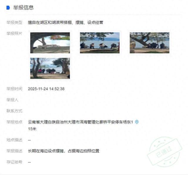 2025年11月24日,有群众通过“洱海卫士”小程序举报称:大理市洱海管理处廊桥附近的洱海湖滨带范围内,存在摆摊设点行为。