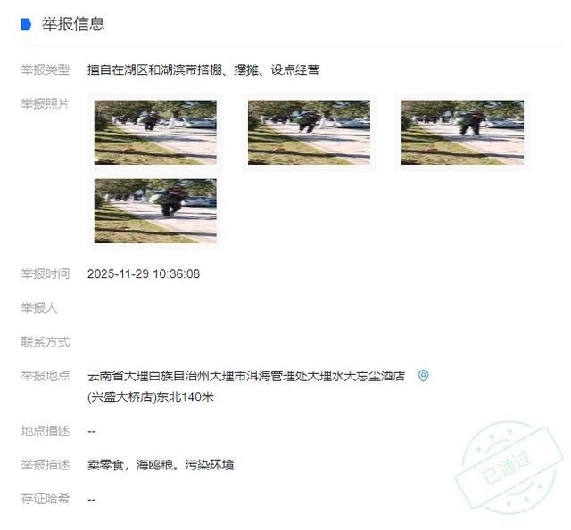 2025年11月29日,有群众通过“洱海卫士”小程序举报称:云南省大理白族自治州大理市洱海管理处大理水天忘尘酒店附近的洱海湖滨带范围内,存在摆摊设点行为。