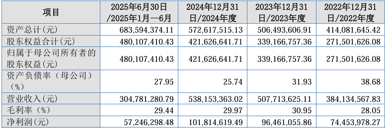 财务方面,于2022年度、2023年度、2024年度及2025年1-6月,公司实现营业收入分别约为3.84亿元、5.08亿元、5.38亿元、3.05亿元人民币;同期,公司净利润分别约为7445.40万元、9646.11万元、1.02亿元、5724.63万元人民币。