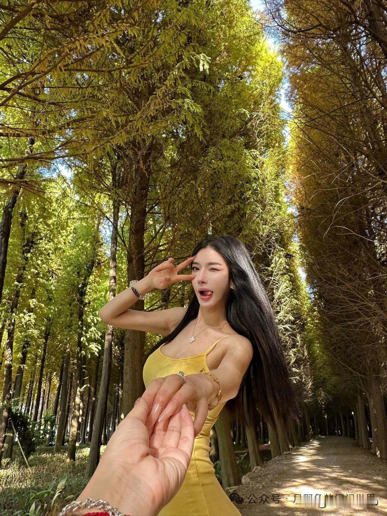 阳光洒在森林小径,穿着黄色长裙的少女在树影间漫步。阳光白裙少女 棕裙少女照 黄昏漫步女神 淡黄色裙装 黄衣少女的春景 绿裙子少女 黄色度假裙