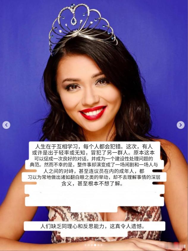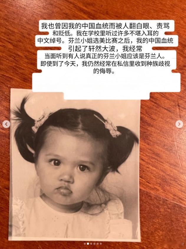 2016 年的芬兰小姐Shirly Karvinen在社交媒体上表示:“我也曾因我的中国血统而被人翻白眼、责骂和贬低。我在学校里听过许多不堪入耳的中文绰号。芬兰小姐选美比赛之后,我的中国血统引起了轩然大波,我经常当面听到有人说真正的芬兰小姐应该是芬兰人。即使到了今天,我仍然经常在私信里收到种族歧视的侮辱。”她的母亲是中国人,父亲是芬兰人。我说过很多次了:无论你出生在中国大陆、港台包括海外,乃至入了外国籍,理性的华人都会期待你自己的国家和中国能够越来越好。成为外国人融入新的国家不意味着一定要否定甚至仇视自己原来的民族和国家。这只会让你被两方排斥。否定自己的原来的民族和国家并不会让你赢得更多尊重,你越抹黑中国,你在海外被歧视羞辱的概率就越大!无论你对中国有多少不满甚至仇恨,哪怕你入了外籍,在外国人眼里你永远是Chinese,无论你愿不愿意!你可以不喜欢中国,但最起码请客观看待她!芬兰小姐被剥夺头衔中文道歉又反转
