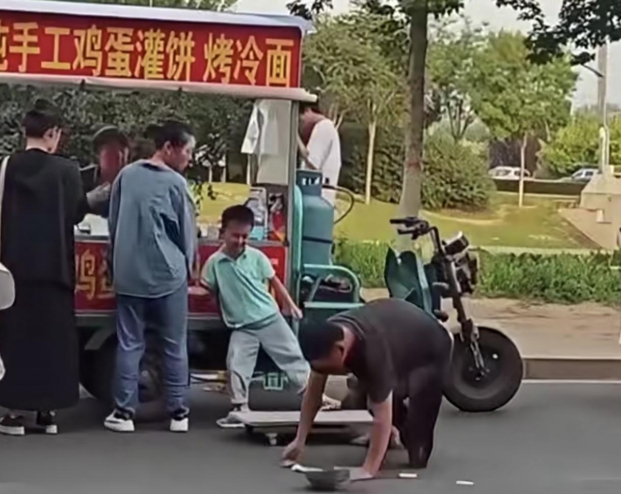 男孩跟爸爸路边买小吃, 碰到“残疾人”乞讨 “残疾人”一直向小男孩乞讨,小男孩觉