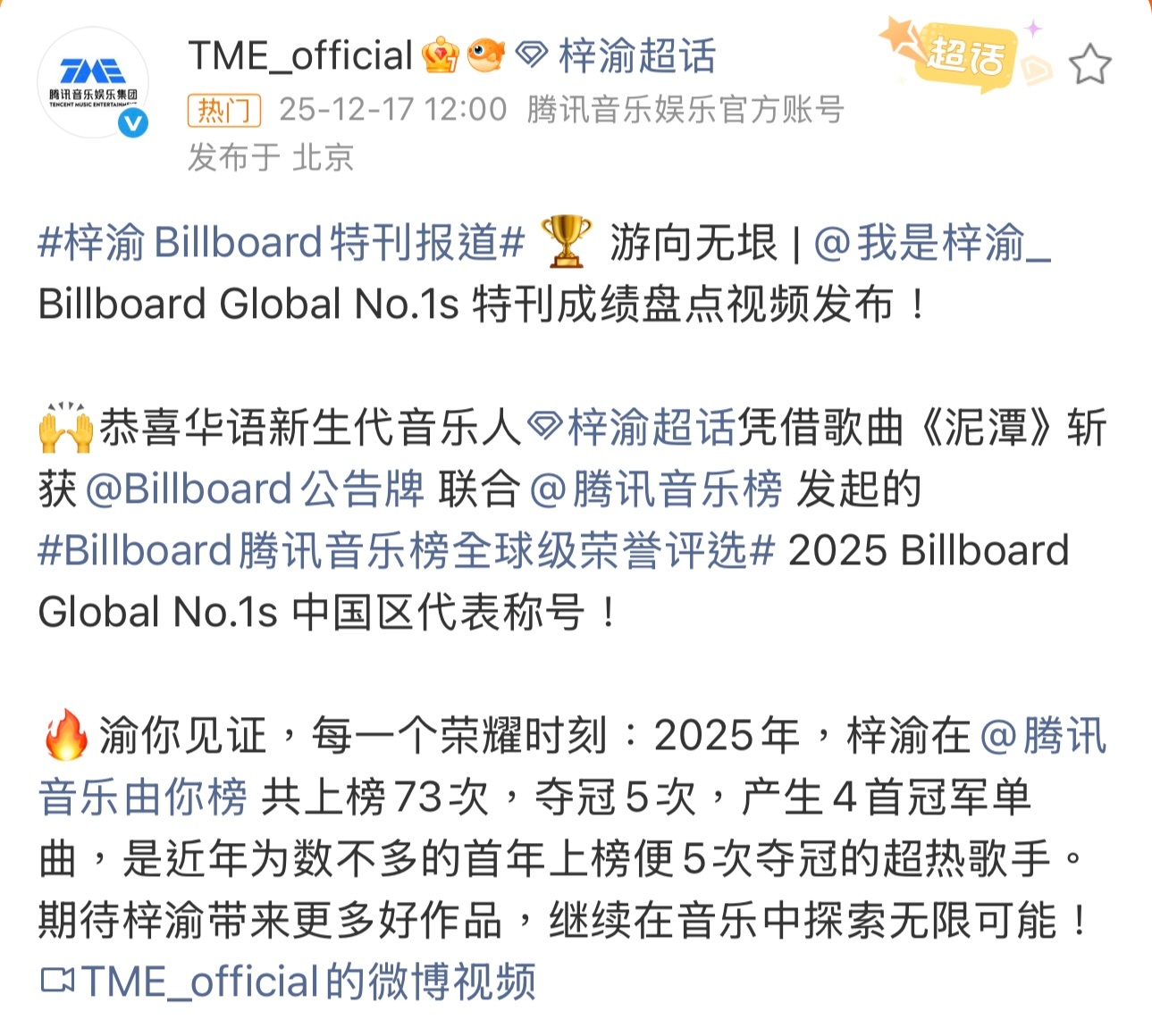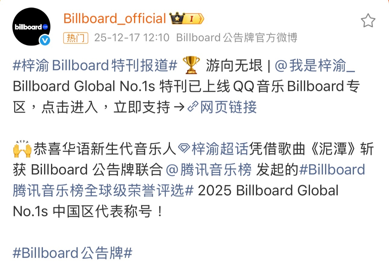 梓渝凭借歌曲《泥潭》获2025 Billboard Global No.1s 中国区代表称号!TME官方提到,梓渝是近年来为数不多的首年上榜便5次夺冠的超热歌手,太厉害了!