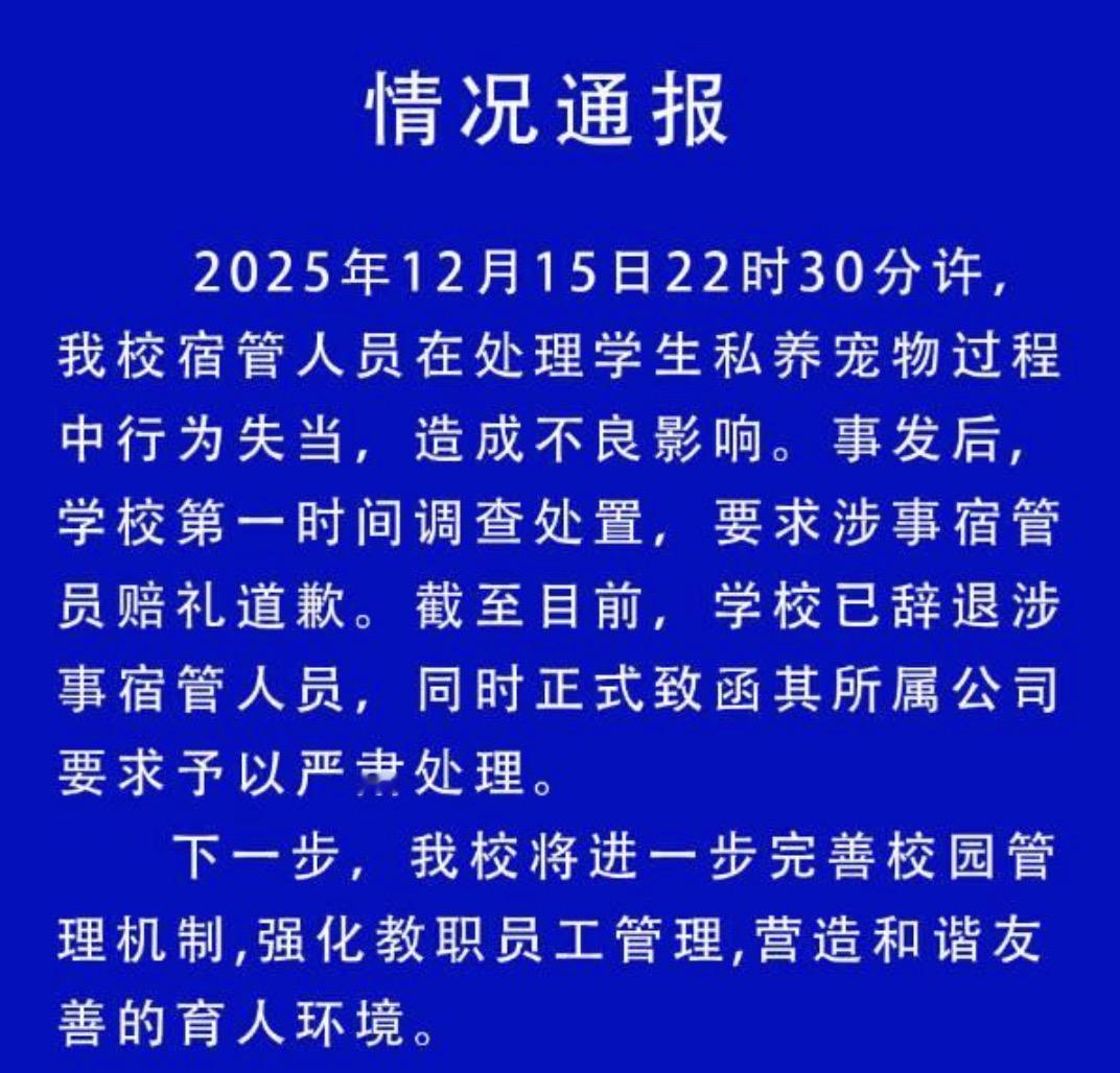 湖南湘西一职校的宿管员,当学生的面摔死小猫事件有了结果! 涉事学校发布了情况通报,称已经要求其赔礼道歉,学校也已经将其给辞退,并且致函其所属的公司,要求予以严肃的处理。诚然,这位所谓的宿管员,他当学生的面摔死小猫的行为是明显失当,所以他被要求赔礼道歉,以及被学校给辞退,这是一点问题都没有的。可问题是他是得到了应有的惩罚,可小猫的主人又得到了什么惩罚吗? 学校有规定宿舍里是不准养宠物的,可这名学生却私自把小猫带了进来,这是他违规在先。这名宿管员说话是很冲,是很让人不舒服,可当时学生的老师也在场,宿管员已经示意老师从中调和。老师也说过把猫给带走,这事就算了。可这名学生却是一意孤行,一边用手机拍摄宿管员的行为,一边用言语刺激着宿管员,要让宿管员摔了他的猫。 宿管员被彻底激怒之后,如这名学生所愿,将小猫给摔死之后,他又不乐意了。随后又在网上,以一个受害者自居,发了掐头去尾的视频,把自己打造成爱猫人士,引导舆论来攻击这名宿管员。摔死小猫的宿管员该骂,而这名学生更该骂!纵观这起事件本身,表面上看害死小猫的是宿管员,其实真正害死小猫的是这名学生。 如果他不把小猫带回宿舍,如果他听从了老师的建议,如果他没有一直激怒教官,小猫又怎么会死?可现在宿管员是被辞退了,还被网友给骂惨了,而作为始作俑者罪魁祸首的学生,却似乎是没有得到任何的惩罚,这很明显是不公平的!所以我觉得涉事学校,要想公平的处理问题,平息大众的怒火,不仅要处理涉事的宿管员,涉事的学生同样也应该受到处分。