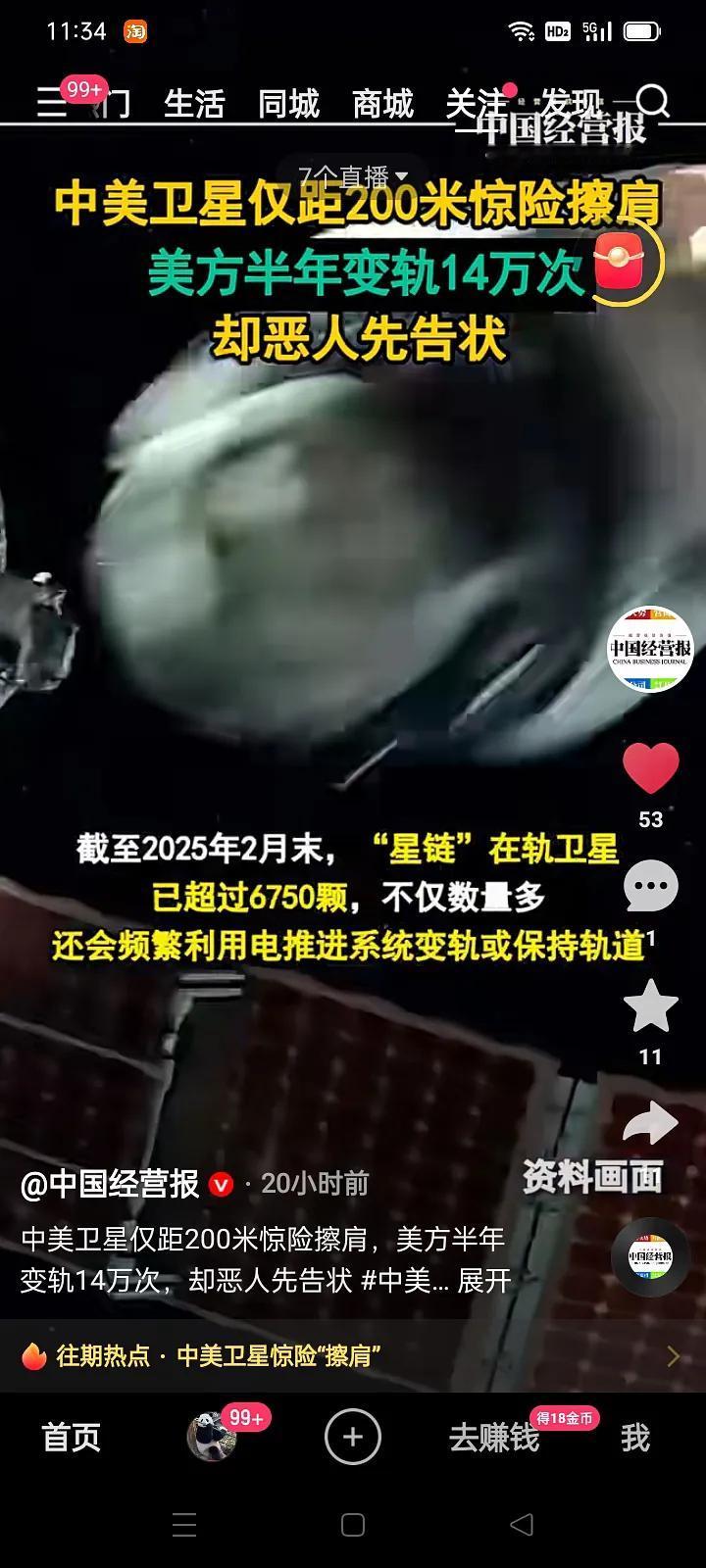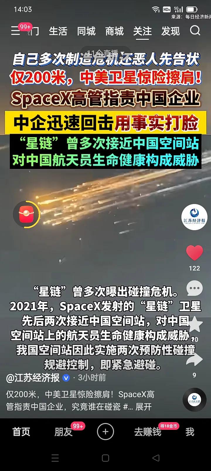 美国‘星链’劣迹斑斑,无耻嫁祸中企! 近日中、美的两颗卫星距离200来米擦肩而过,美国星链公司副总裁污蔑中国企业发射卫星‘不专业’。 早在2021年星链有两颗卫星先后以危险方式蓄意接近中国空间站,对中国宇航员的生命健康和空间站的安全造成严重威胁! 幸亏中国航天技术过硬,及时采取变轨躲避措施,才‘幸免于难’! 但是美国星链的阴险卑劣和包藏祸心可见一斑。 我觉得,中国当时应该就此向星链提出索赔诉讼,并且进行国家制裁!今后如果星链胆敢再次恶意伤害中国空间站或者中国卫星,我们就可以直接把它击毁!否则强盗就会把我们当做病猫欺负。 另外星链已经部署了近6800颗卫星,抢占了近地轨道的主要空间,它们还嚣张跋扈地恶意满满地在半年内变轨14万次,对中国等国的飞船卫星构成了严重挑衅和威胁!