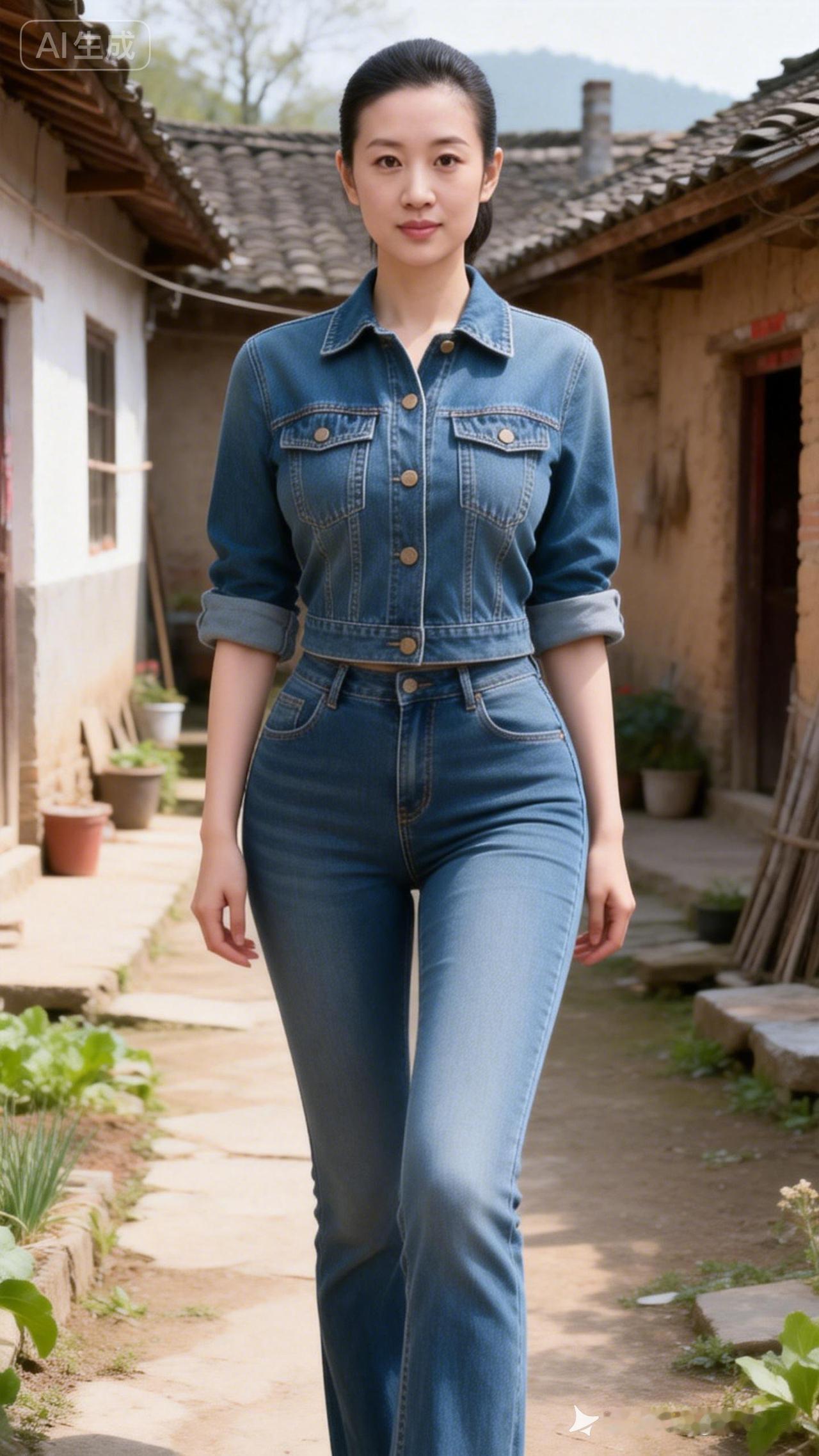 一个穿牛仔套装的姑娘在乡间小路上走。