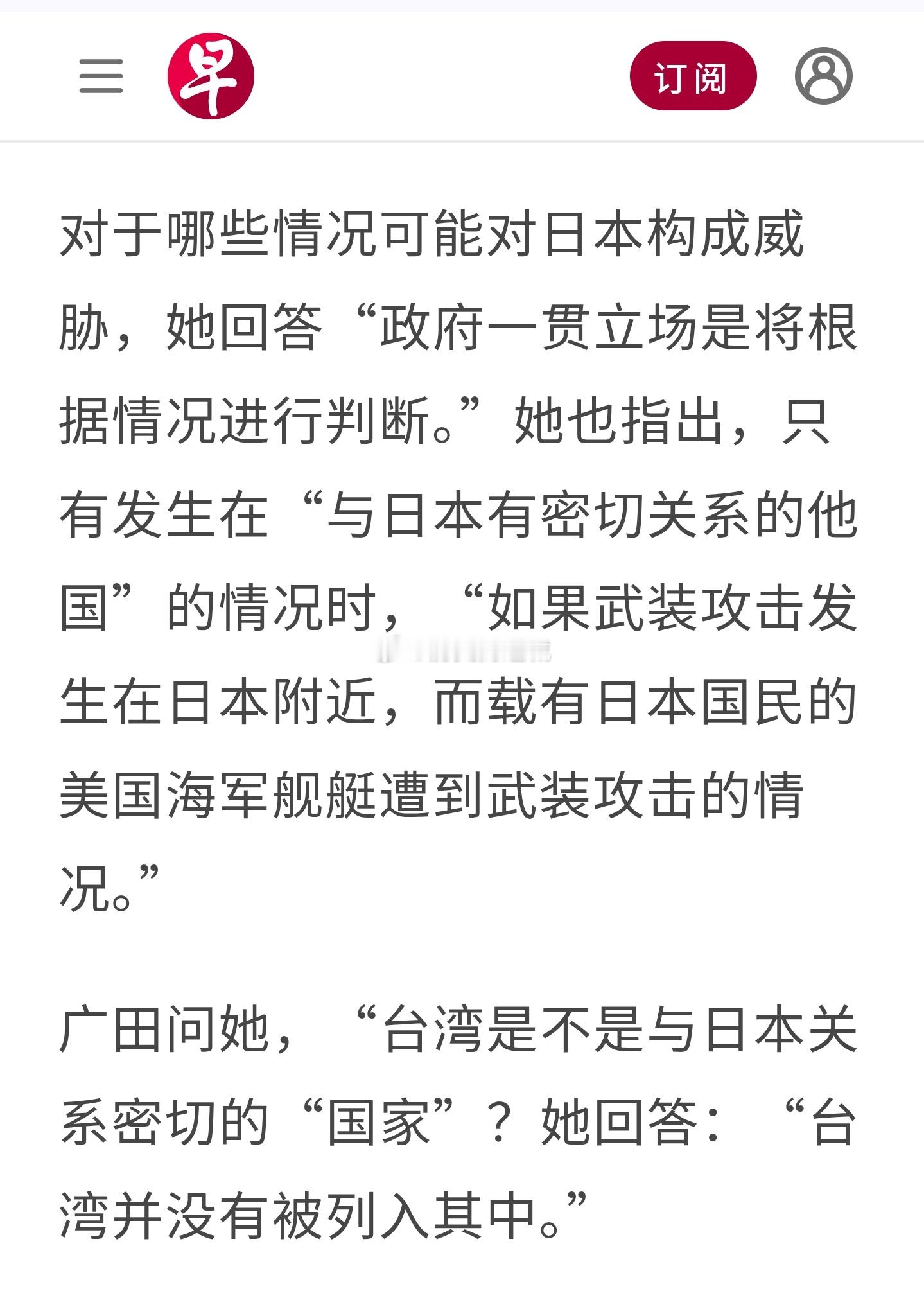 日本首相高市早苗星期三(12月17日)称,日本对中国敞开对话大门,呼吁推进战略互利关系,展示愿意通过对话缓解紧张。高市也在一天前的国会答辩中提到,对引起中国反弹的涉台言论做出“反省”,并明示有关谈话超出了日本政府的“标准答案”。立宪民主党议员广田一星期二(16日)在国会中批评高市“临场表现”过火,广田问她,“台湾是不是与日本关系密切的“国家”?她回答:“台湾并没有被列入其中。”